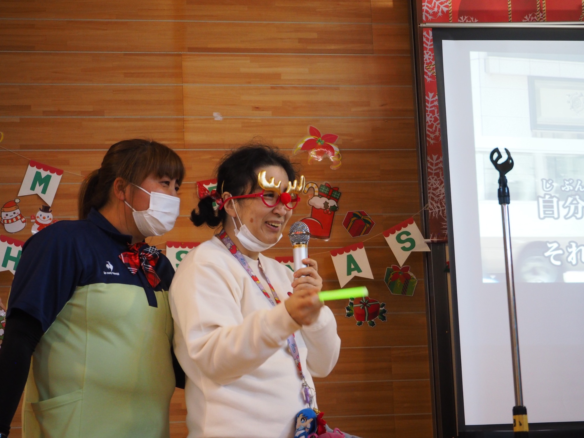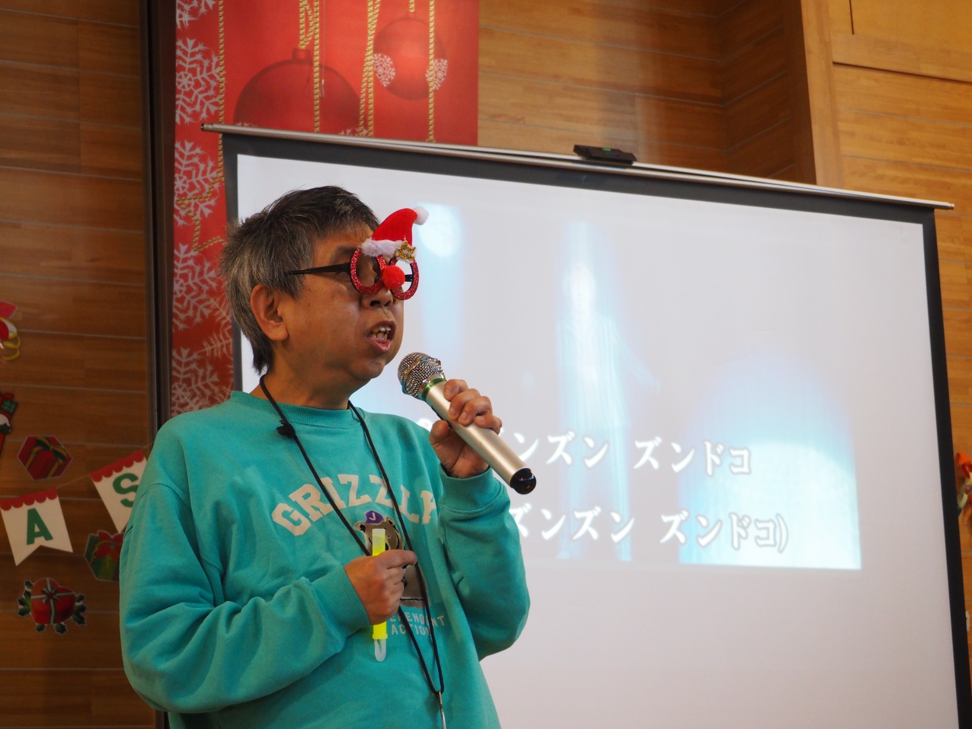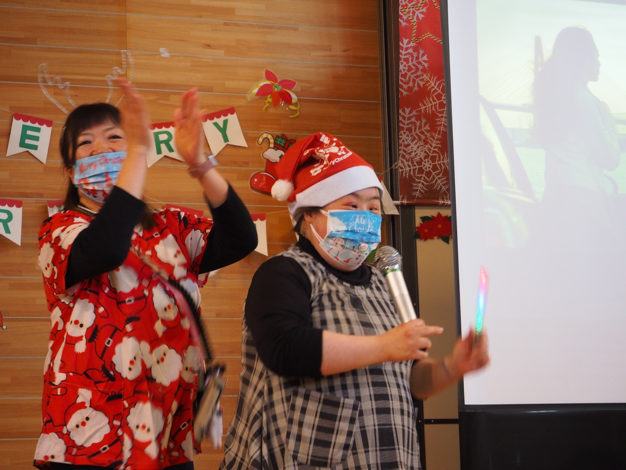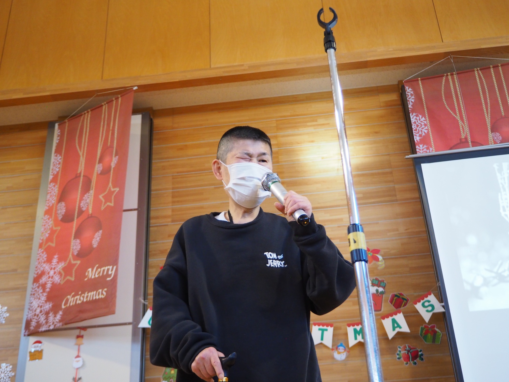 12月19日は一足早いクリスマス行事の日です。午前中は地域交流ホームに集まって盛大にカラオケ大会をしました。日頃練習していることもあってか皆さんなかなかの歌い手です。思い思いに仮装したり、ダンスをしたり手拍子したり、笑顔が弾けていました。この行事に向けて施設内と会場をたくさんきれいに飾りつけてくれた職員の皆さんの演出も光っていました。利用者様の自治会会長発行による参加者一人一人に合わせて作られたユニークな表彰状も配られました。