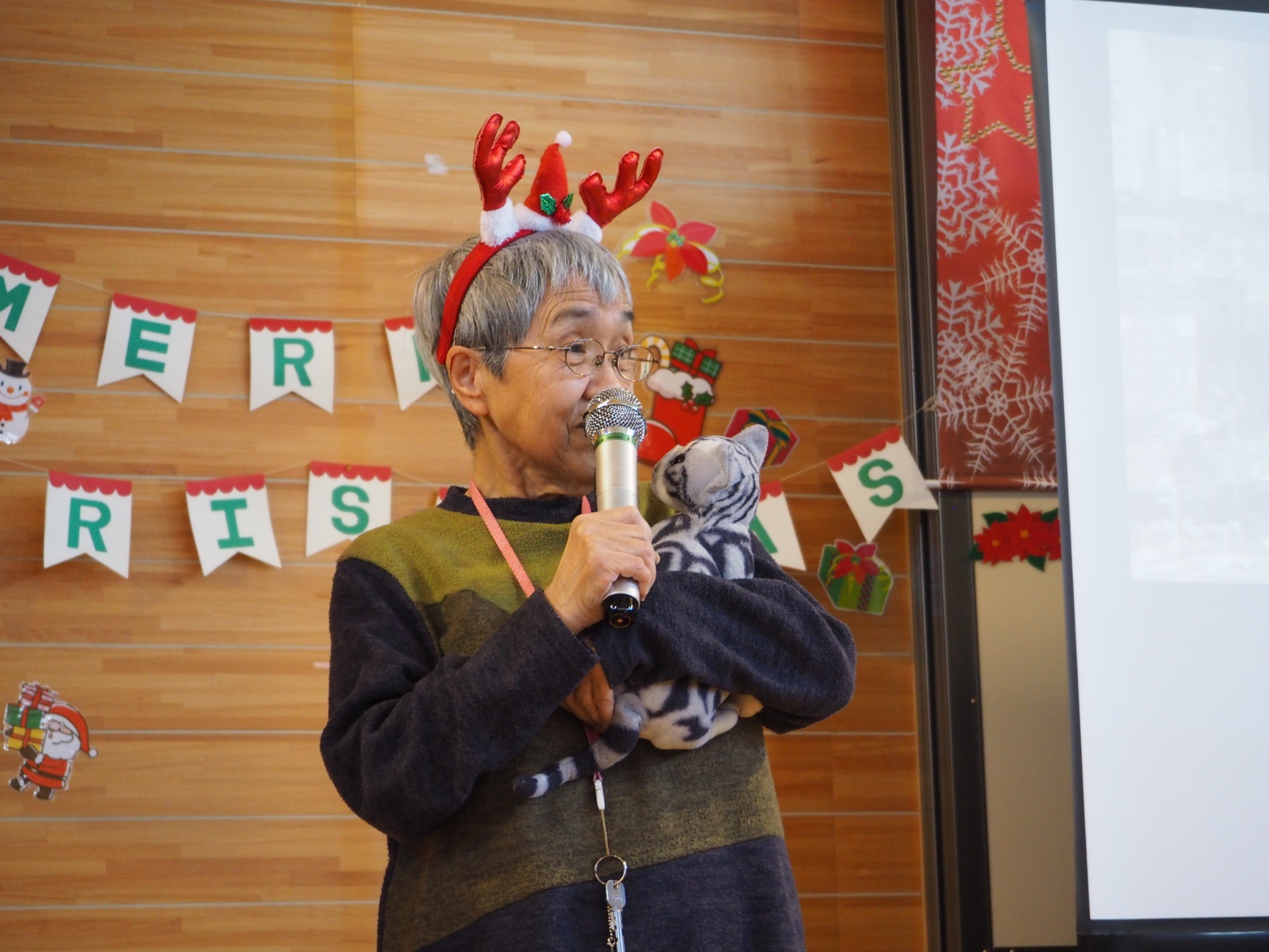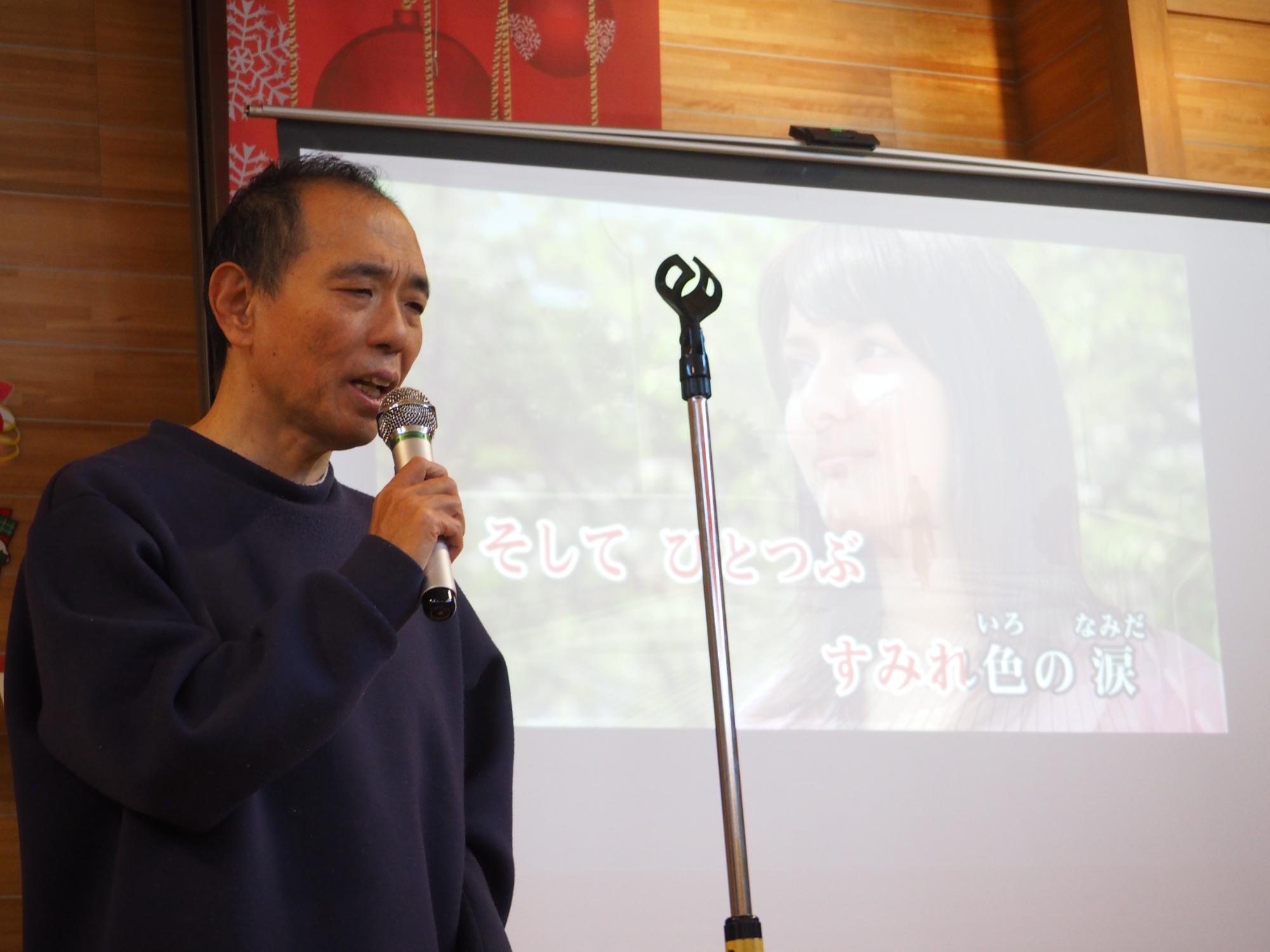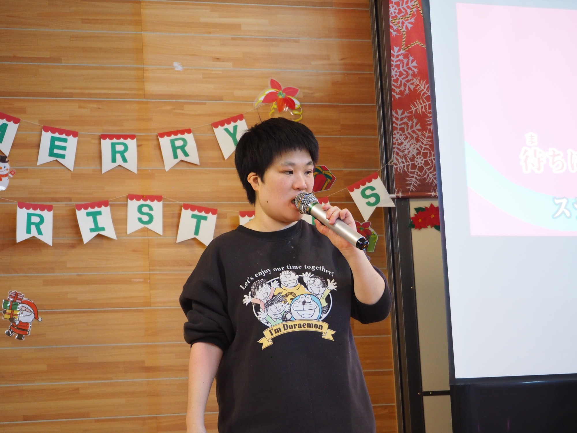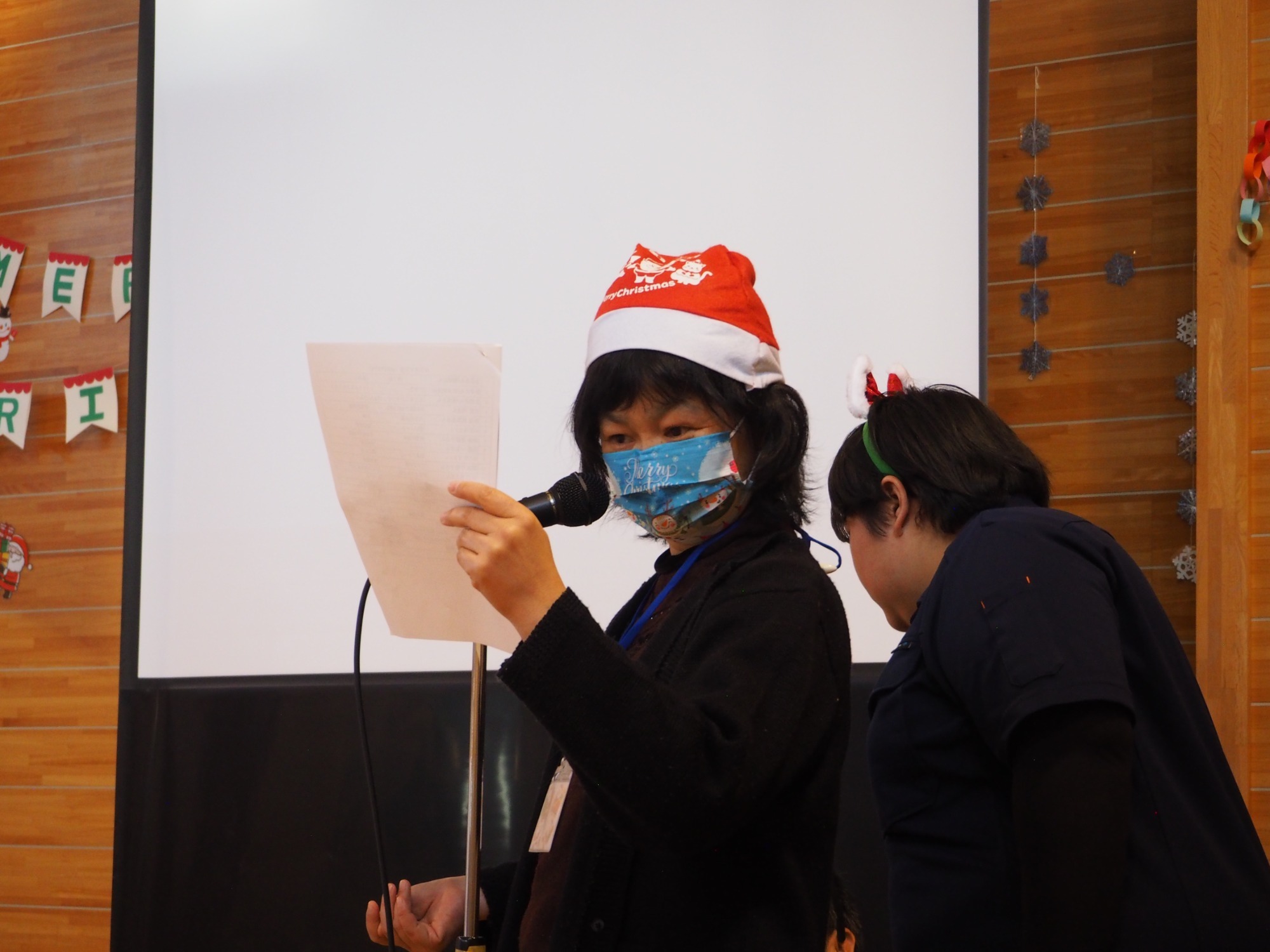 12月19日は一足早いクリスマス行事の日です。午前中は地域交流ホームに集まって盛大にカラオケ大会をしました。日頃練習していることもあってか皆さんなかなかの歌い手です。思い思いに仮装したり、ダンスをしたり手拍子したり、笑顔が弾けていました。この行事に向けて施設内と会場をたくさんきれいに飾りつけてくれた職員の皆さんの演出も光っていました。利用者様の自治会会長発行による参加者一人一人に合わせて作られたユニークな表彰状も配られました。