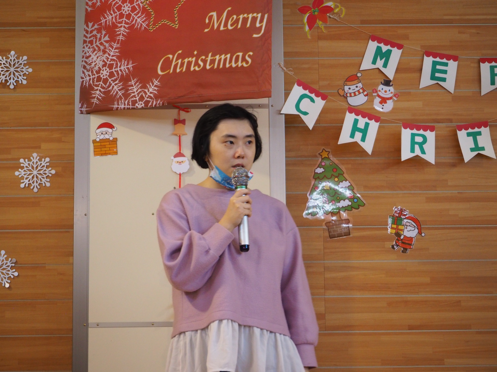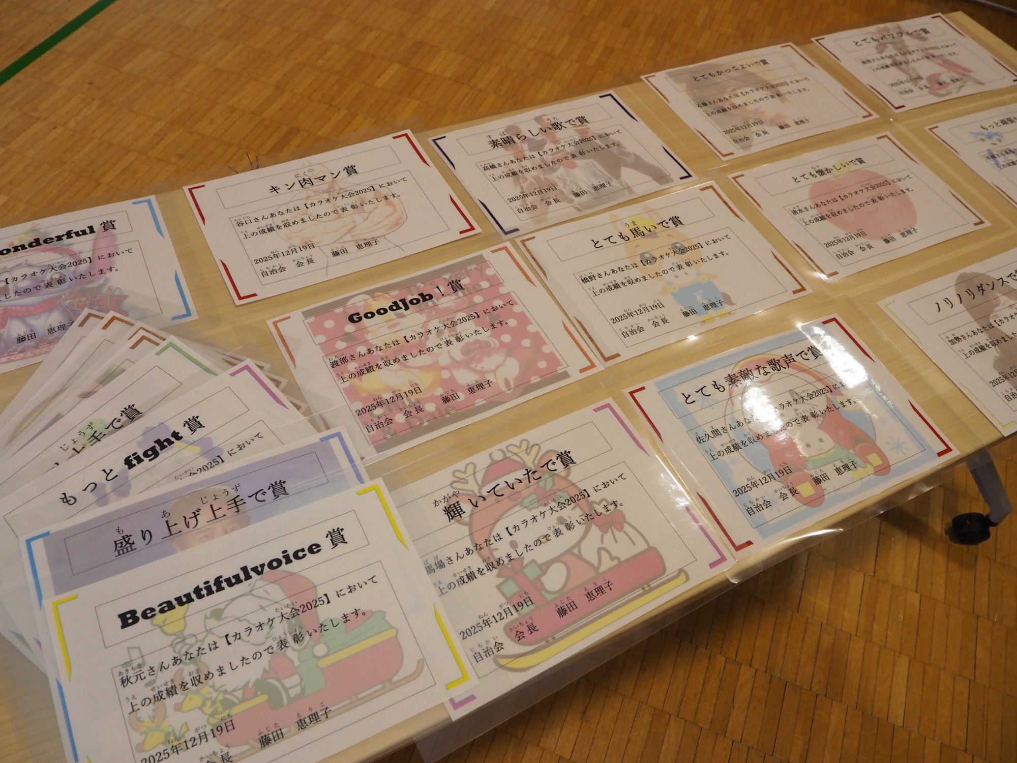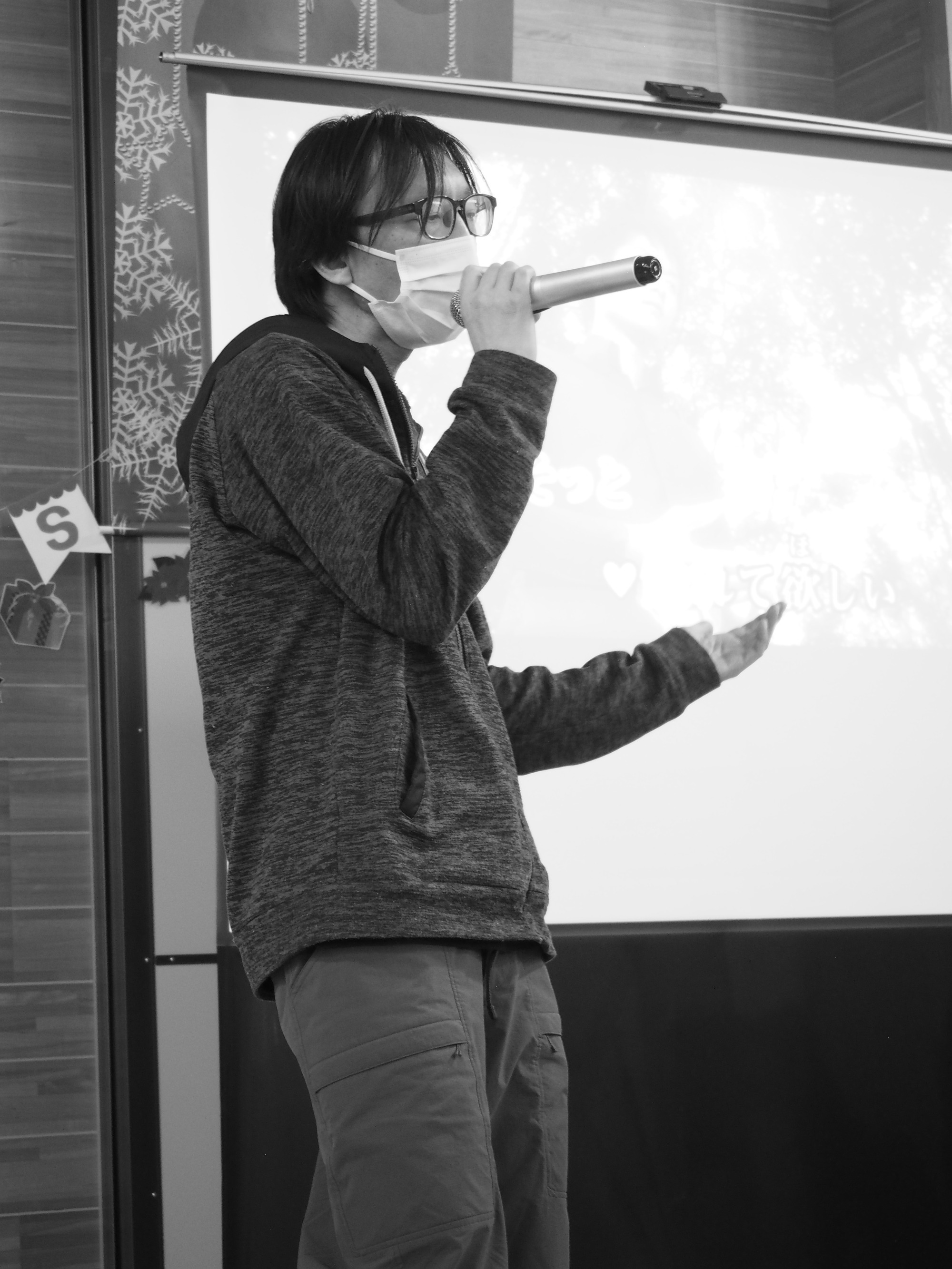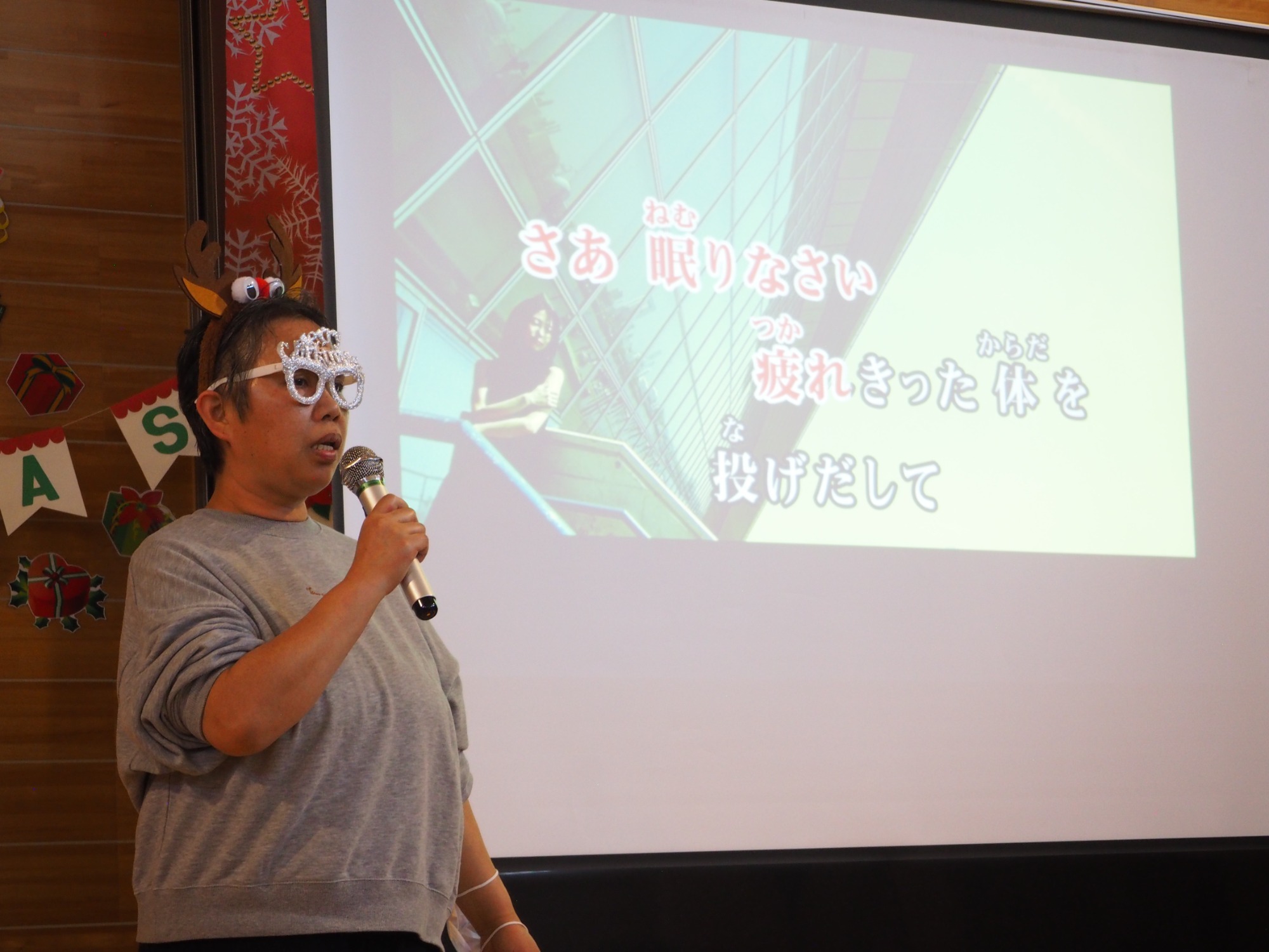12月19日は一足早いクリスマス行事の日です。午前中は地域交流ホームに集まって盛大にカラオケ大会をしました。日頃練習していることもあってか皆さんなかなかの歌い手です。思い思いに仮装したり、ダンスをしたり手拍子したり、笑顔が弾けていました。この行事に向けて施設内と会場をたくさんきれいに飾りつけてくれた職員の皆さんの演出も光っていました。利用者様の自治会会長発行による参加者一人一人に合わせて作られたユニークな表彰状も配られました。