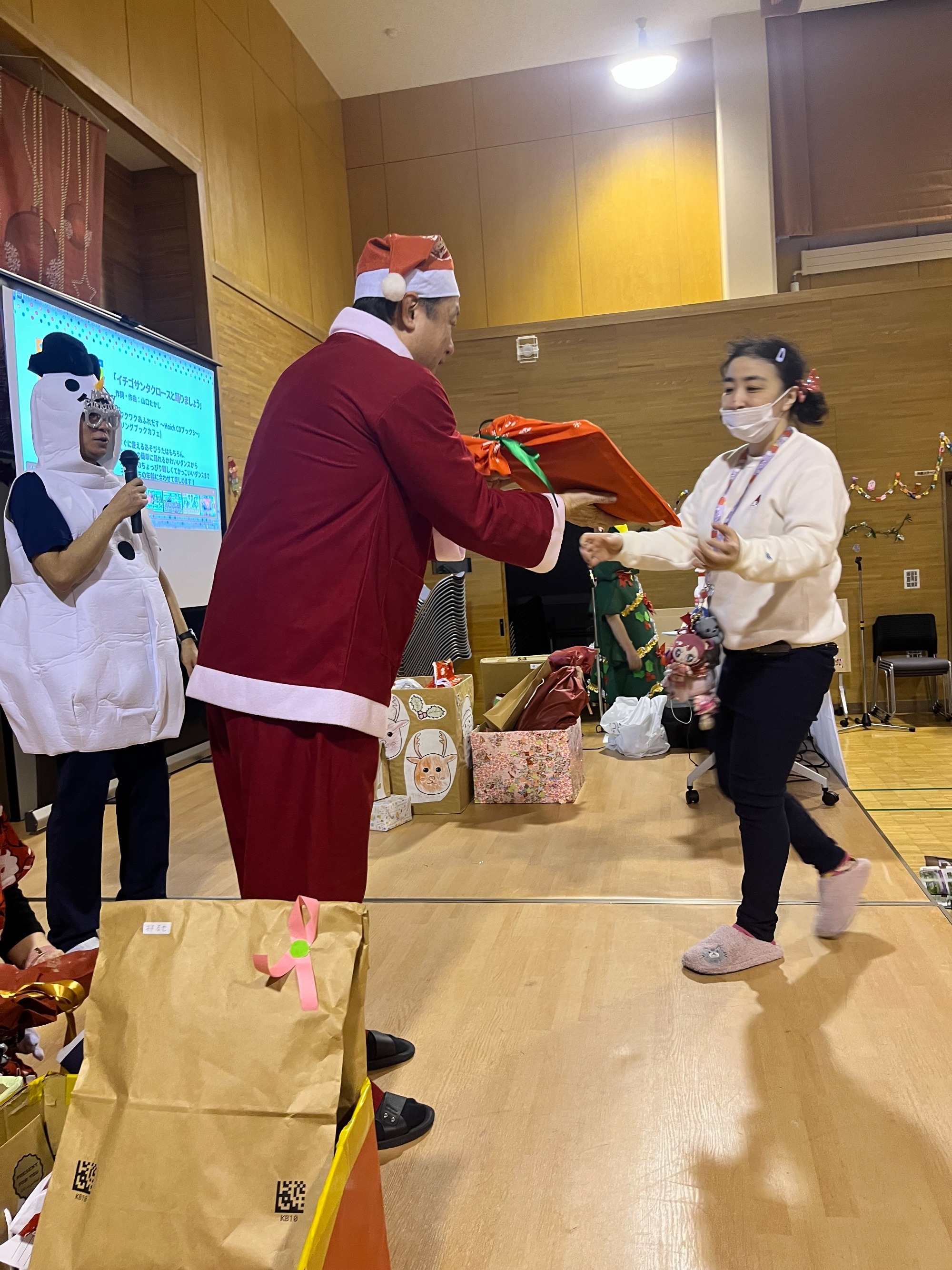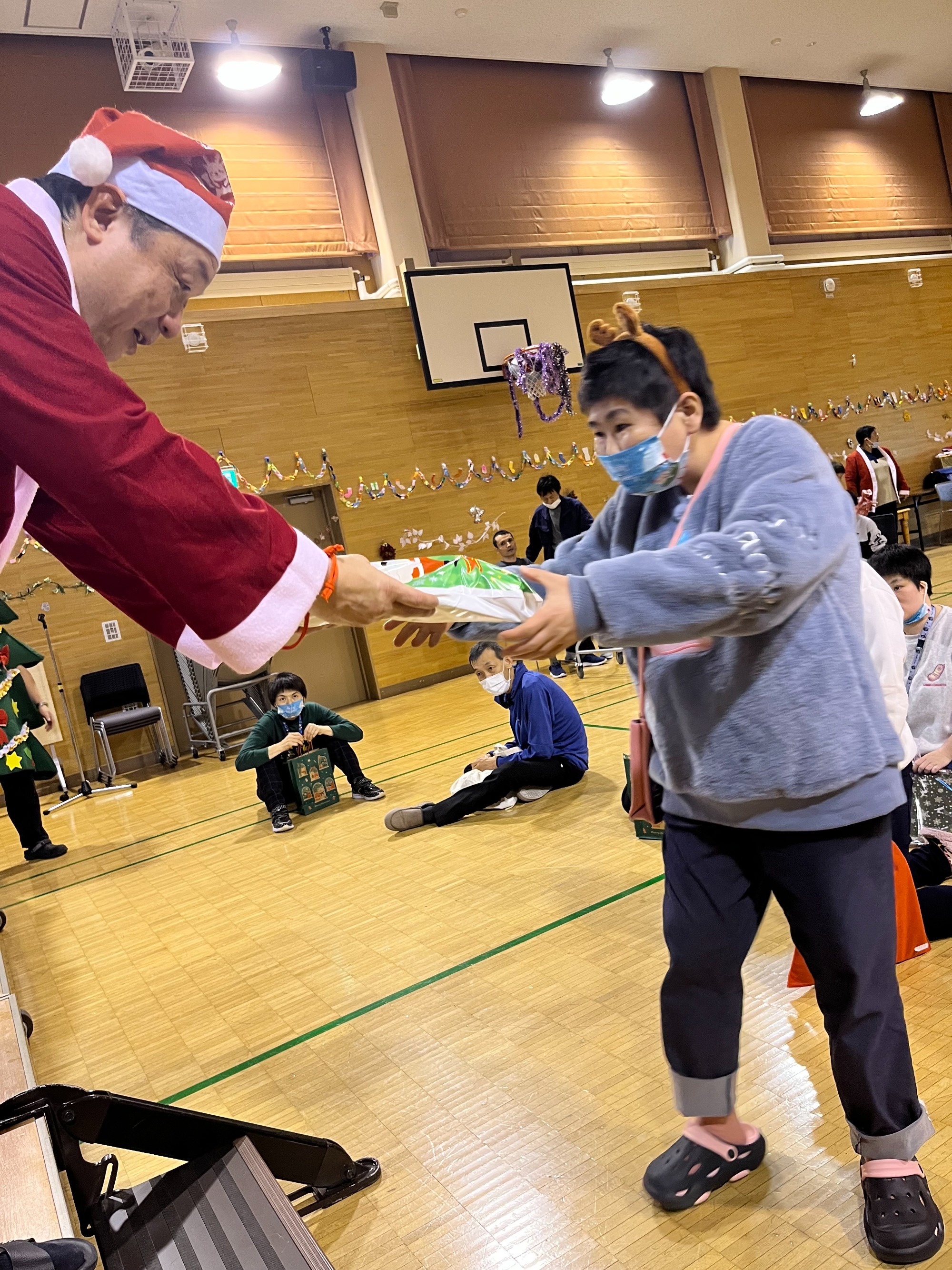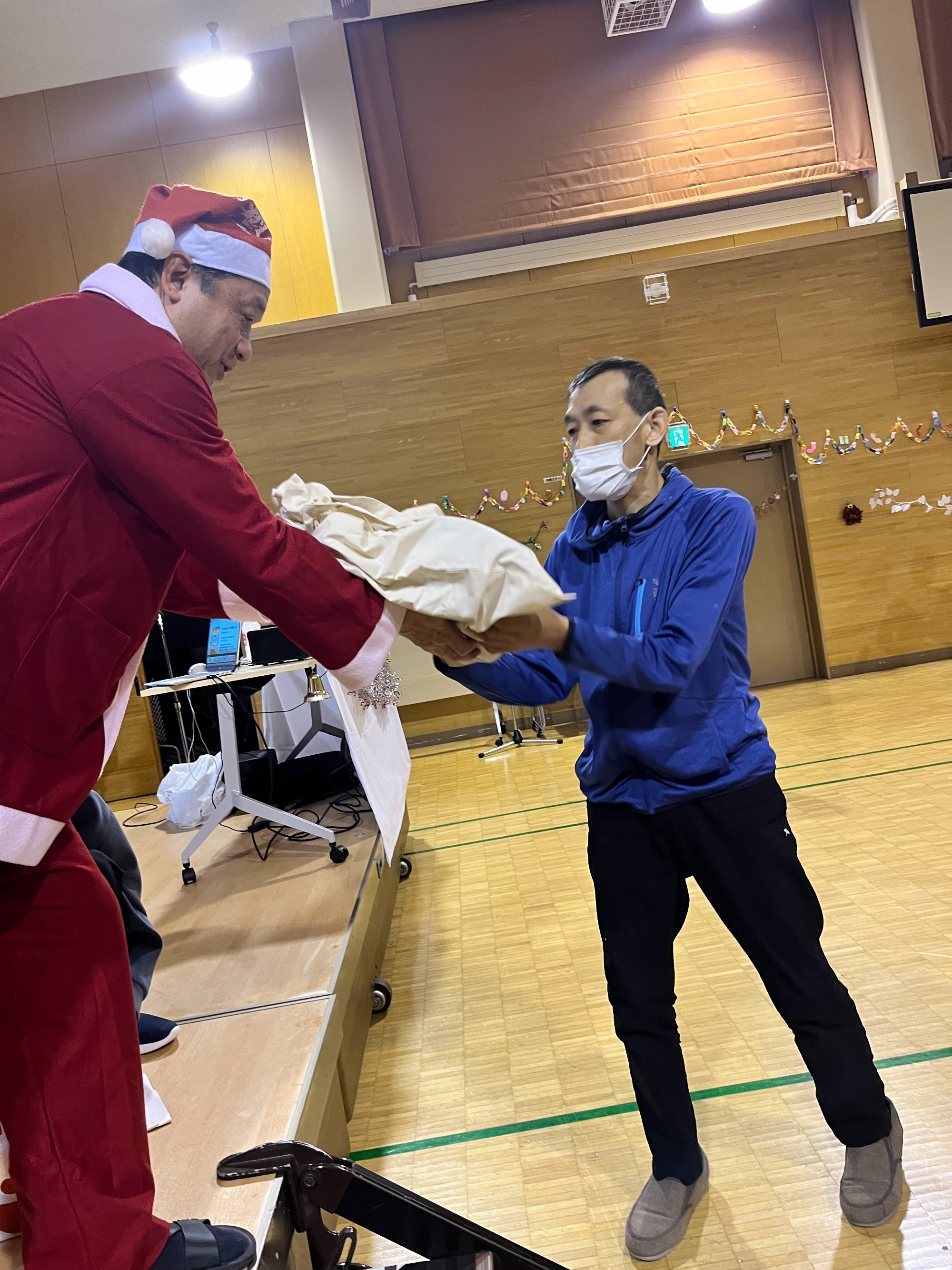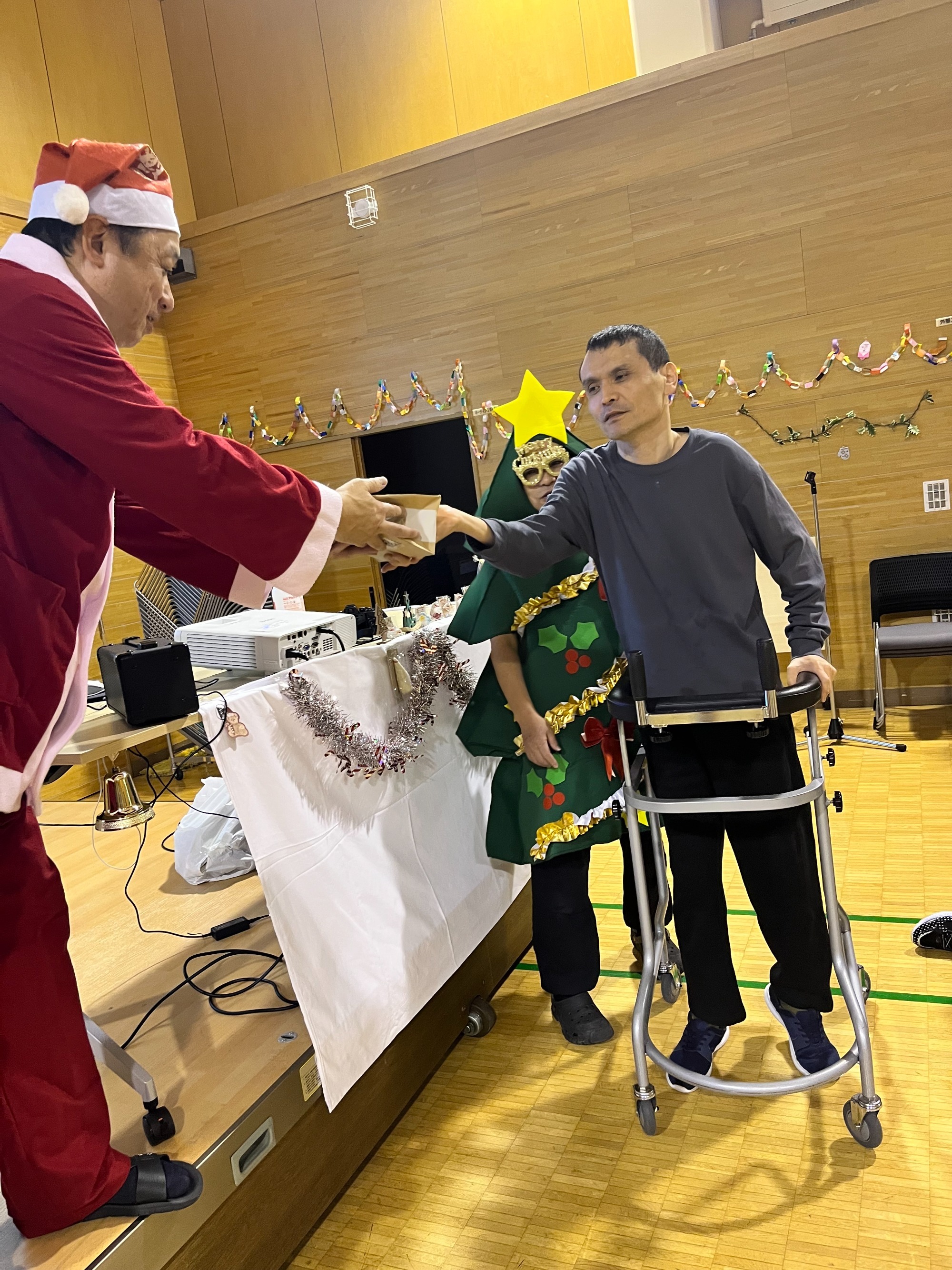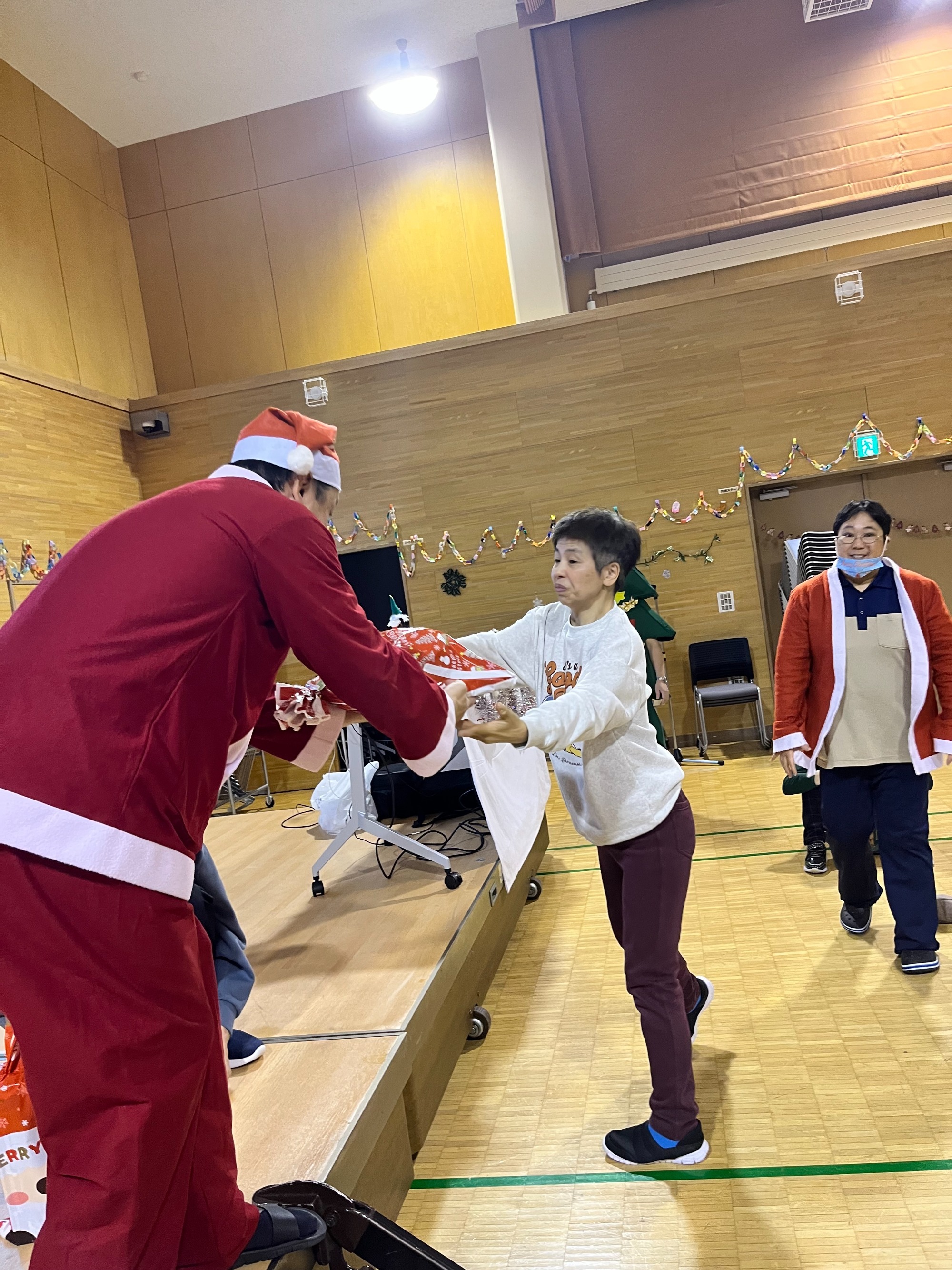 まずは全員でダンス。そして一人ひとりにプレゼント贈呈という流れでした。単にイベントというよりは職員と利用者の皆さんが楽しんでいるようすが伝わってきて、いろんな意味で心あたたまる一日でした。