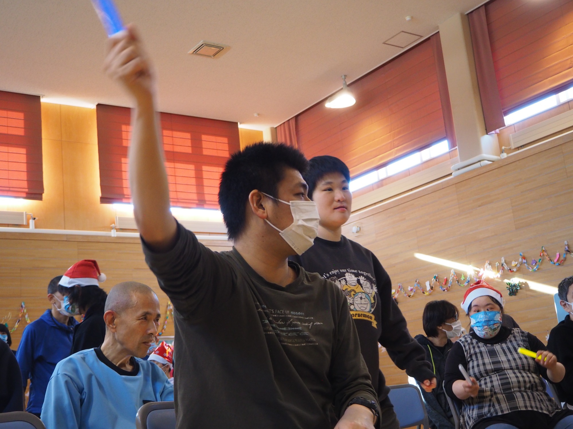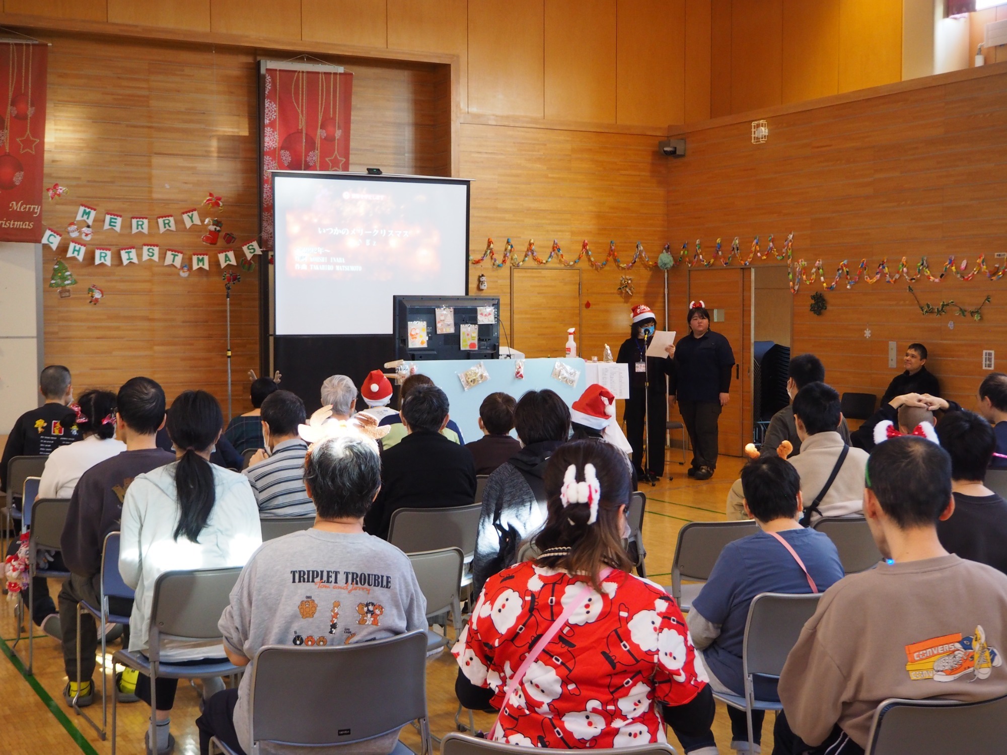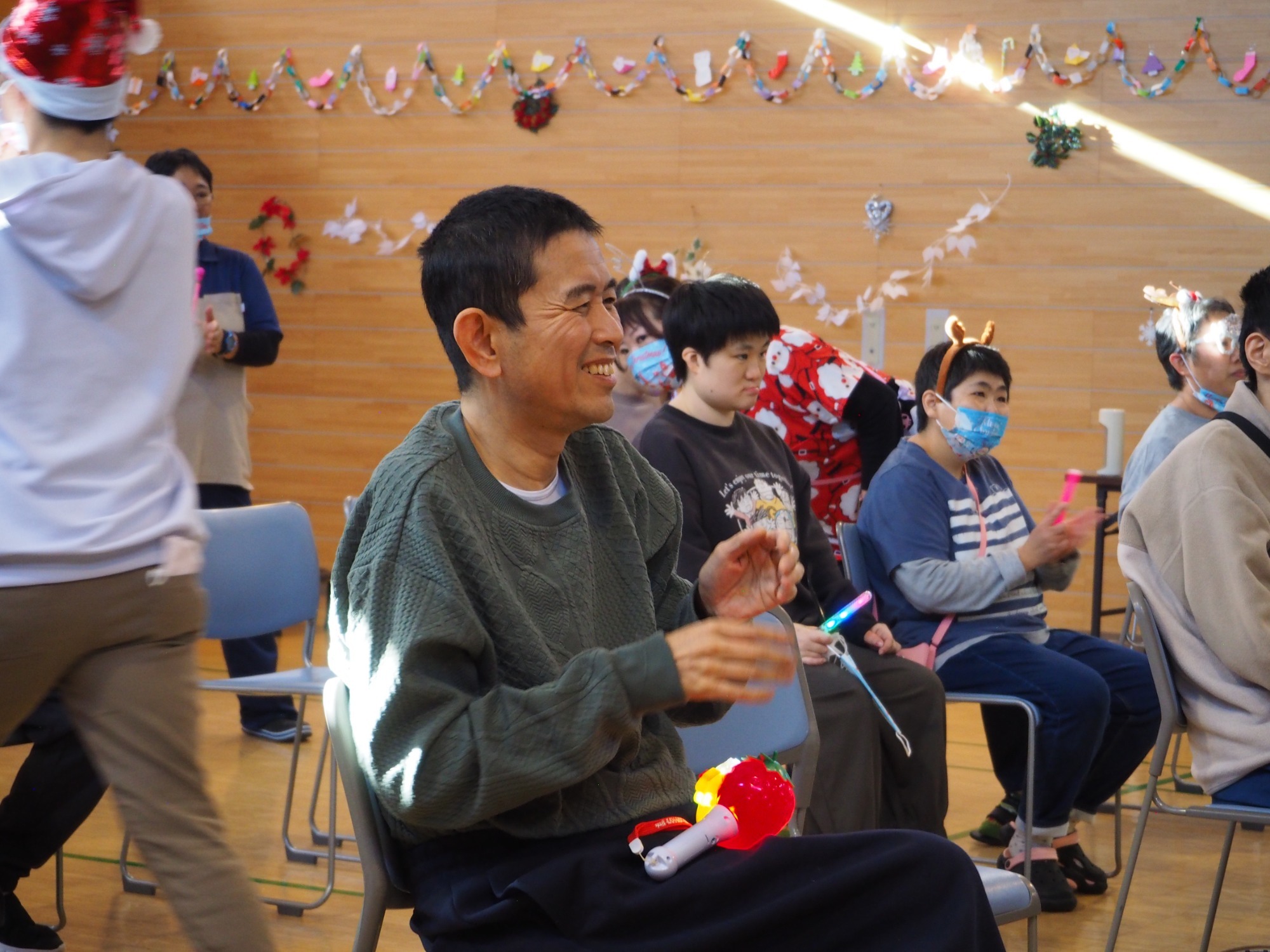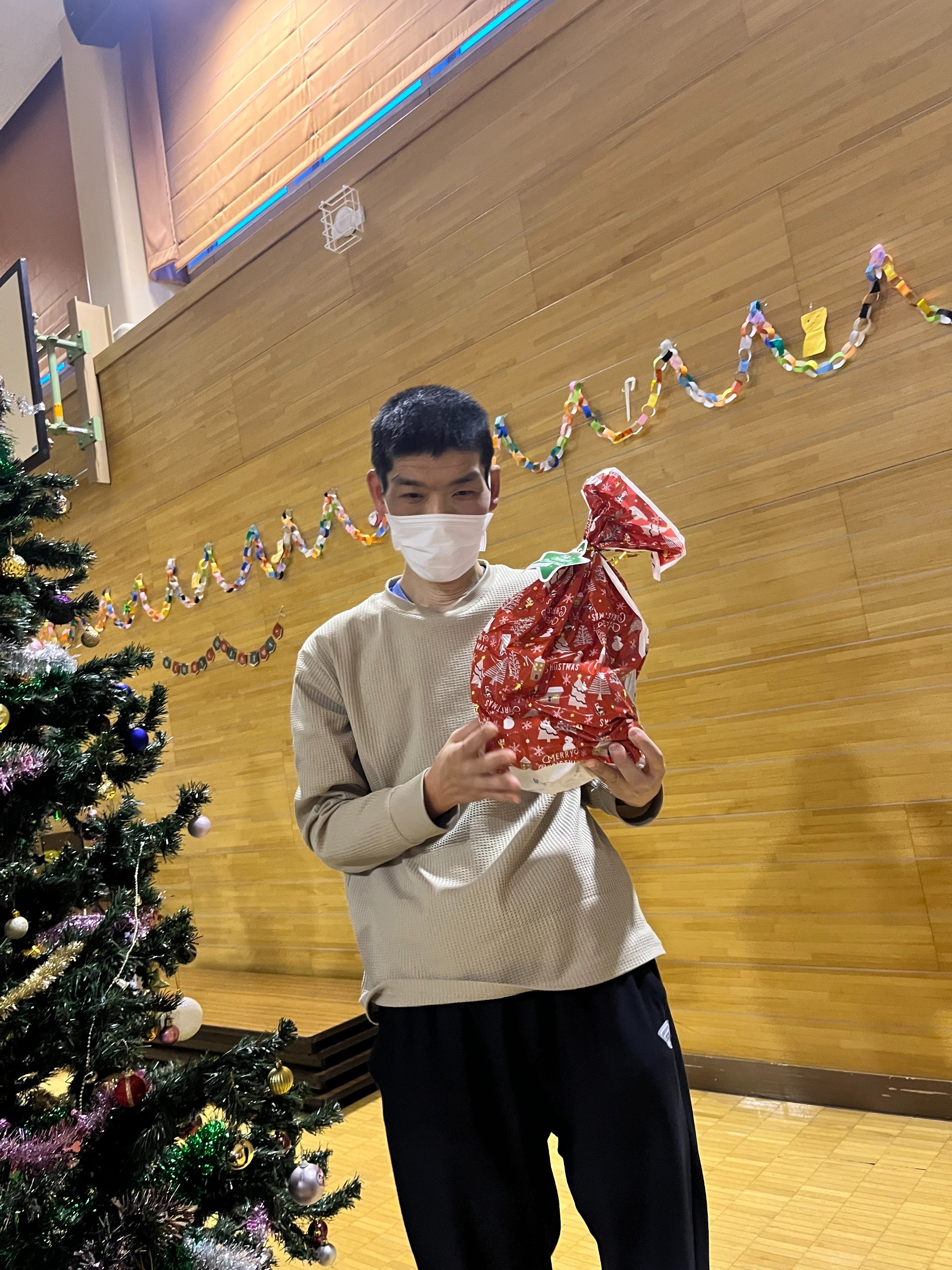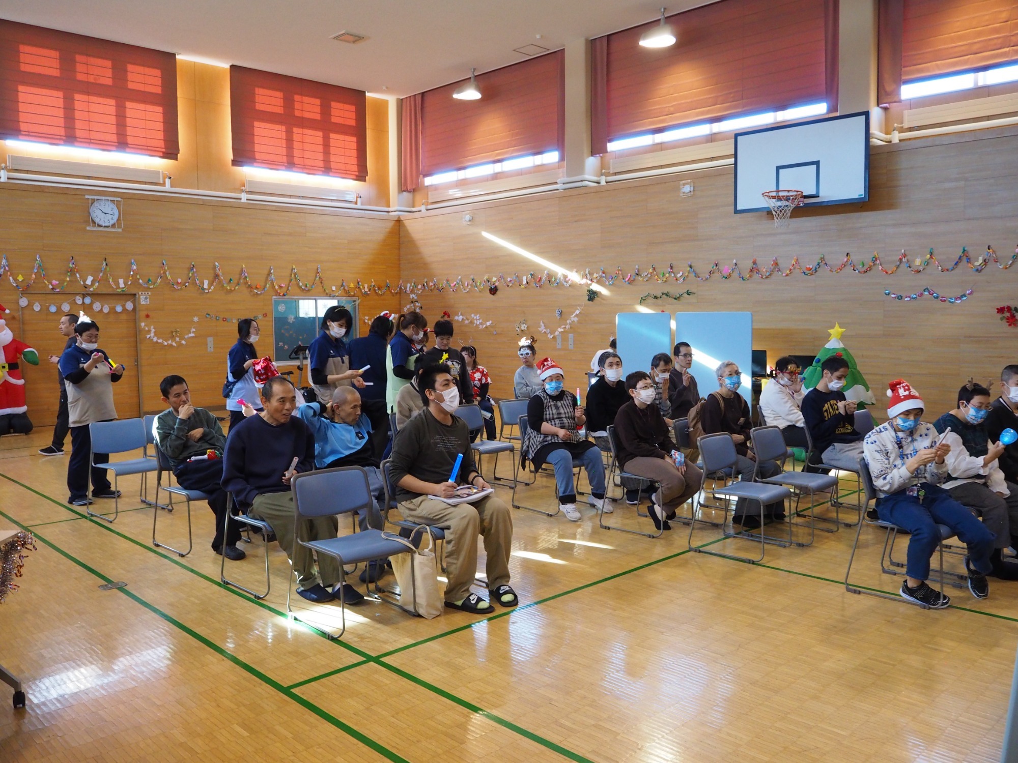 まずは全員でダンス。そして一人ひとりにプレゼント贈呈という流れでした。単にイベントというよりは職員と利用者の皆さんが楽しんでいるようすが伝わってきて、いろんな意味で心あたたまる一日でした。