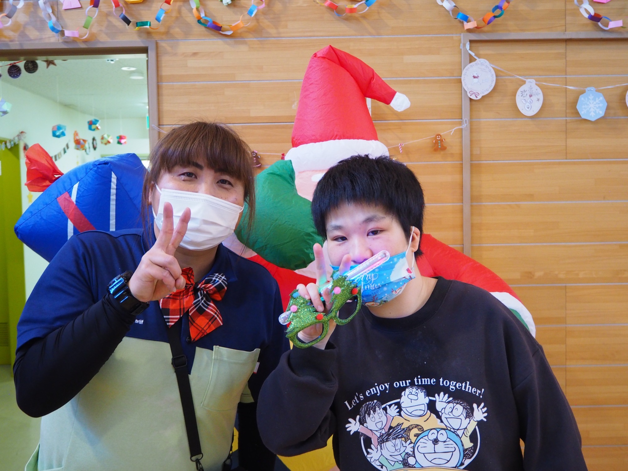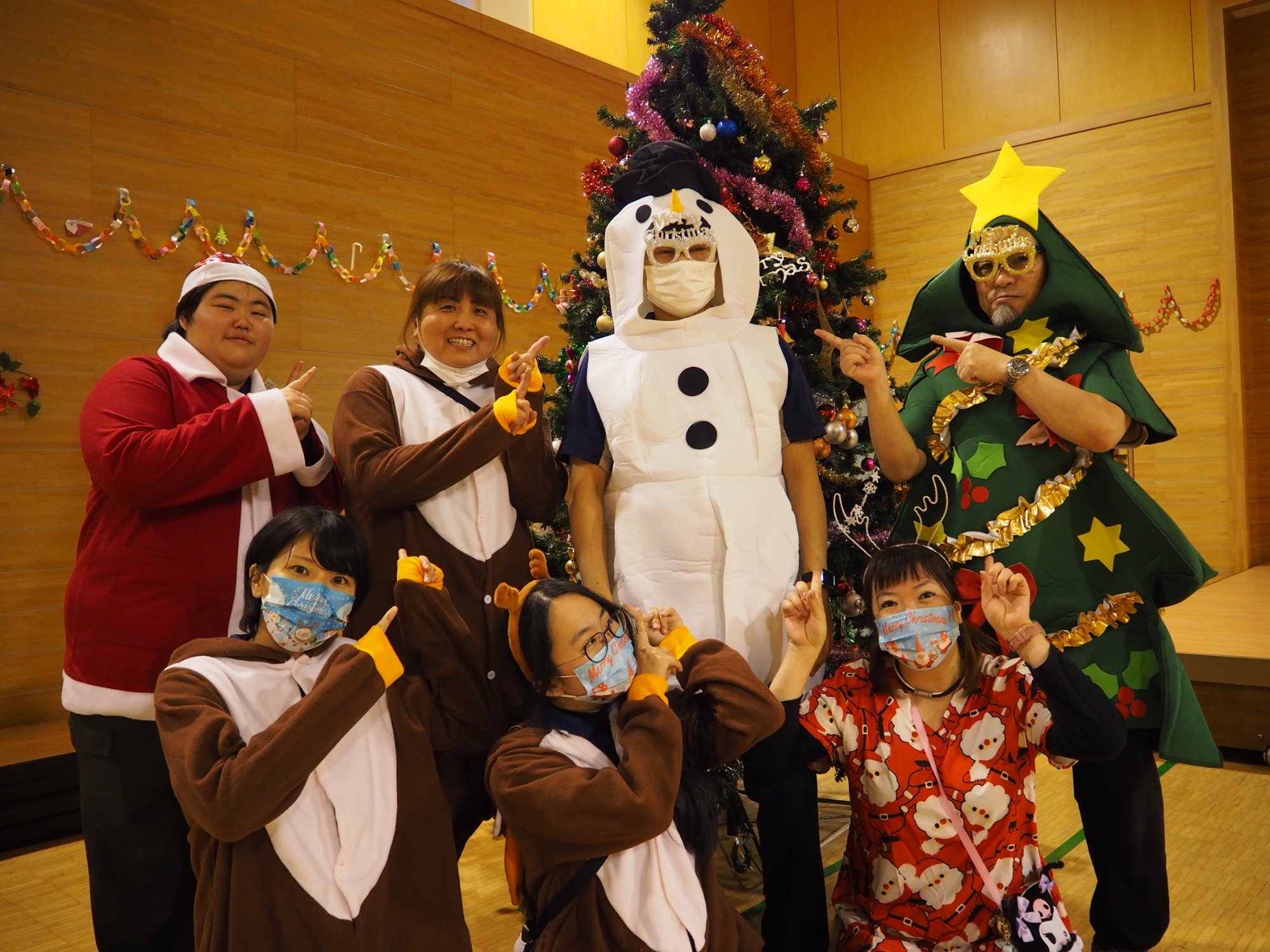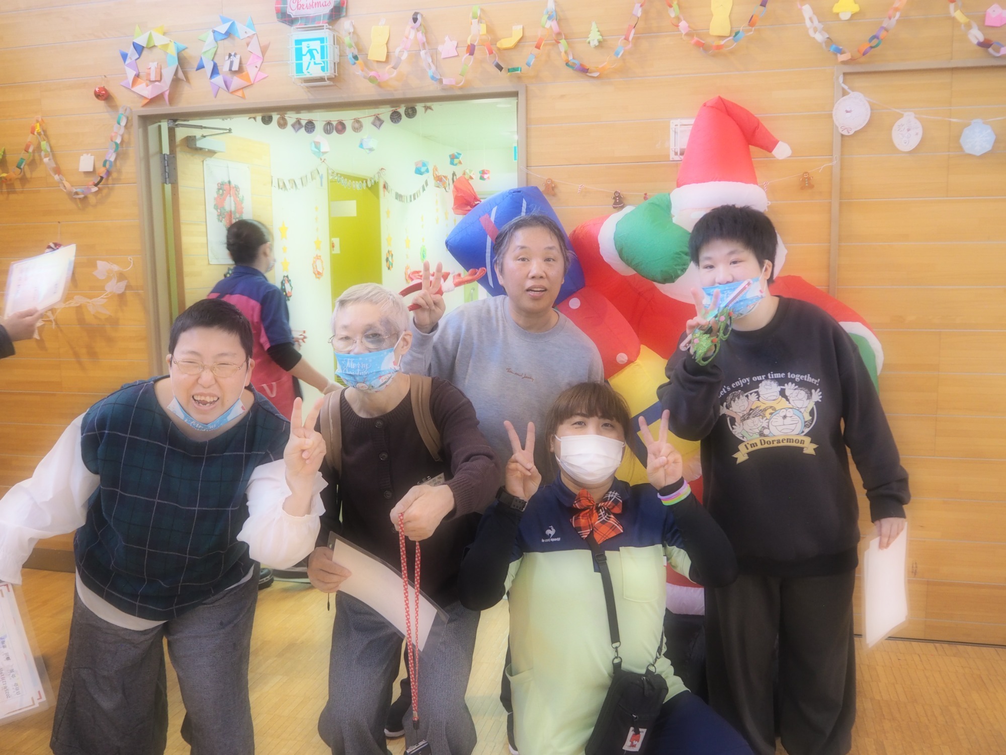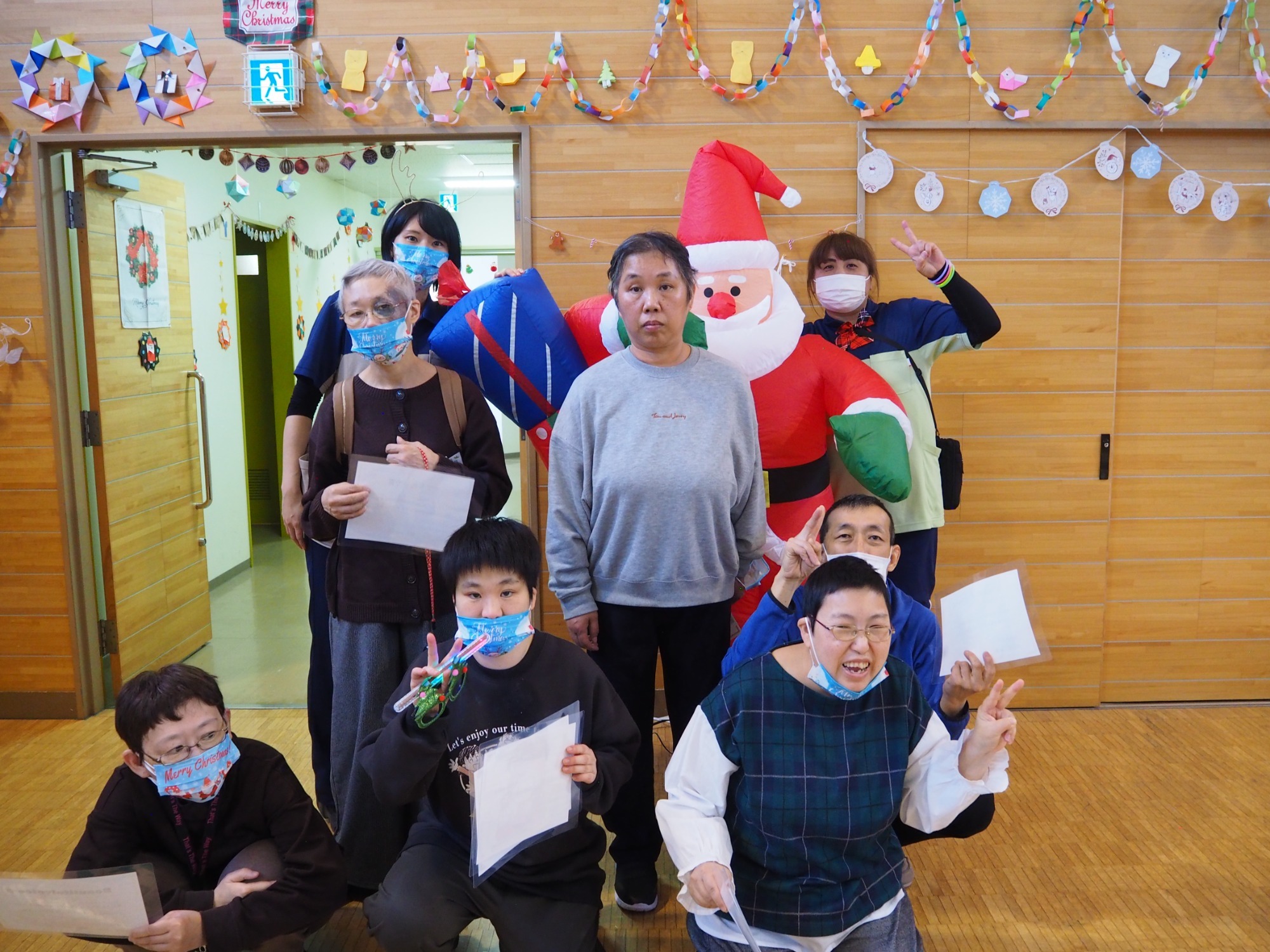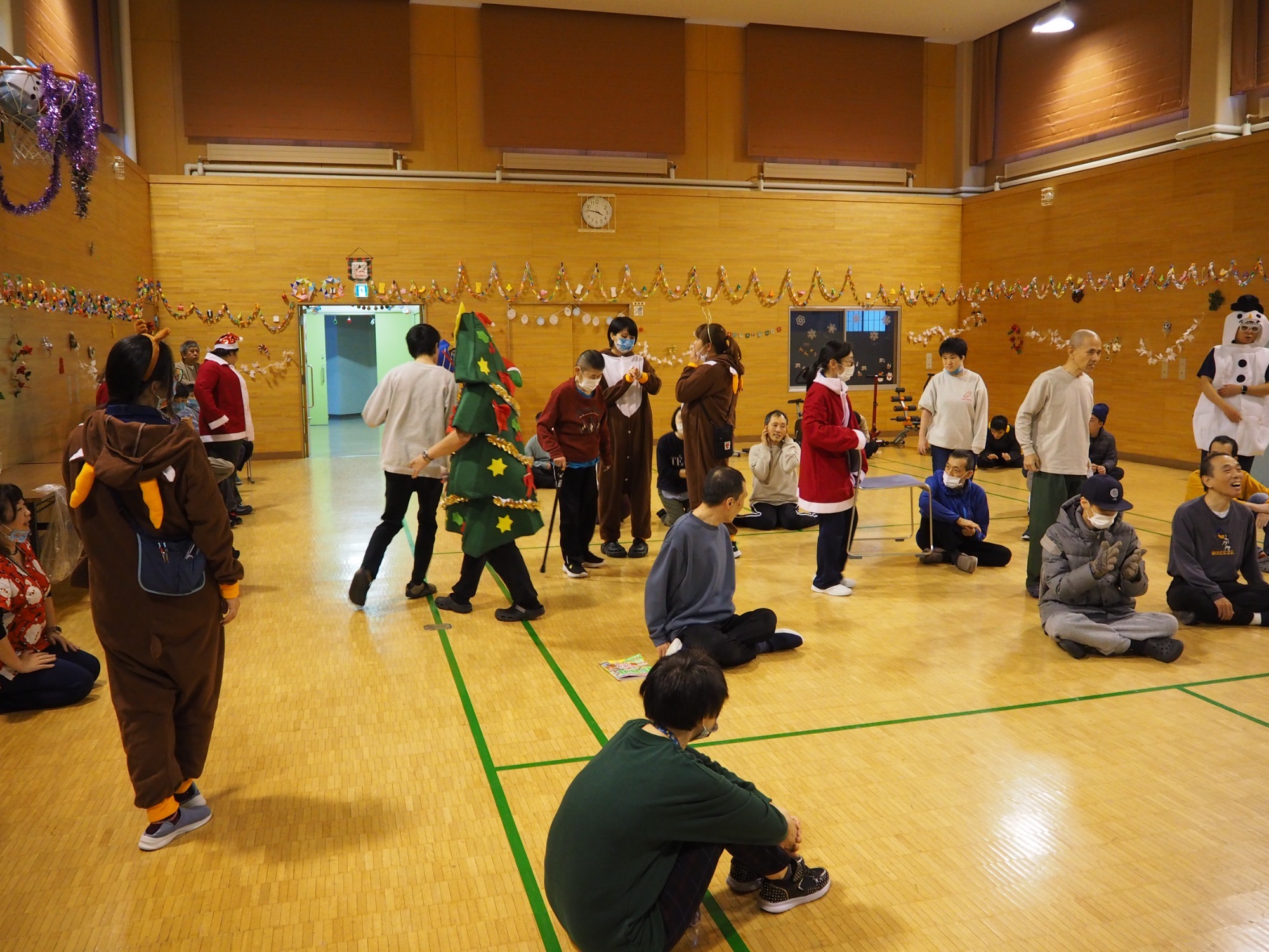 15時過ぎに「施設長、そろそろ踊りの練習しますから。これに着替えてください。(サンタの衣装)」そして夕方の地域交流スペースに集う識別不能な仮装をした職員たち。二回ほどユーチューブに合わせてクリスマスダンスを練習したところで利用者様に集まっていただきます。