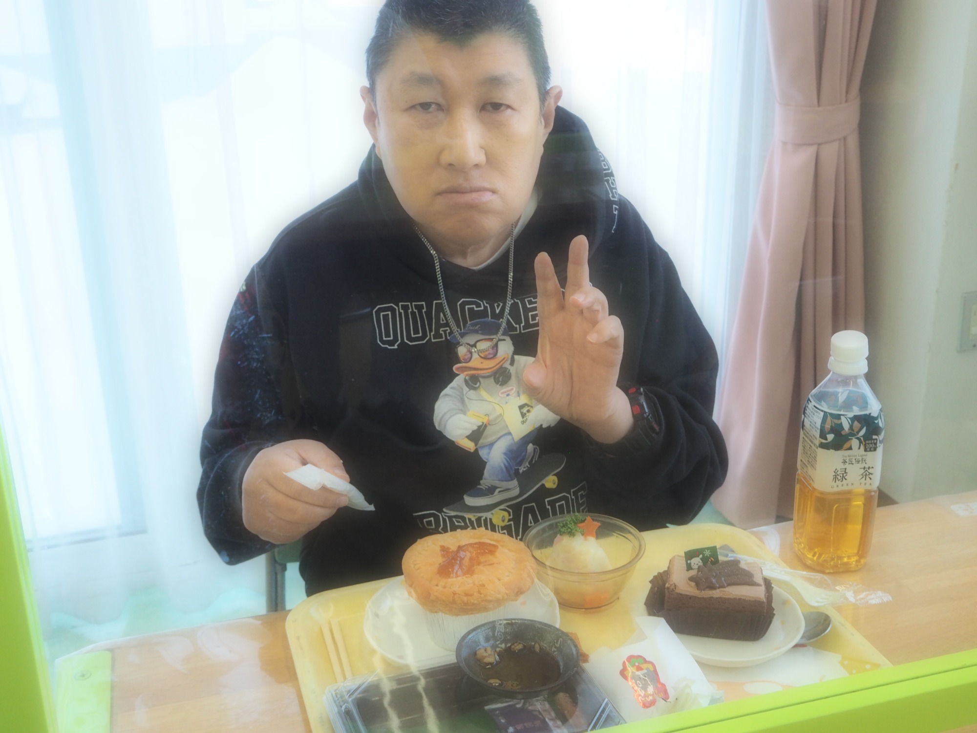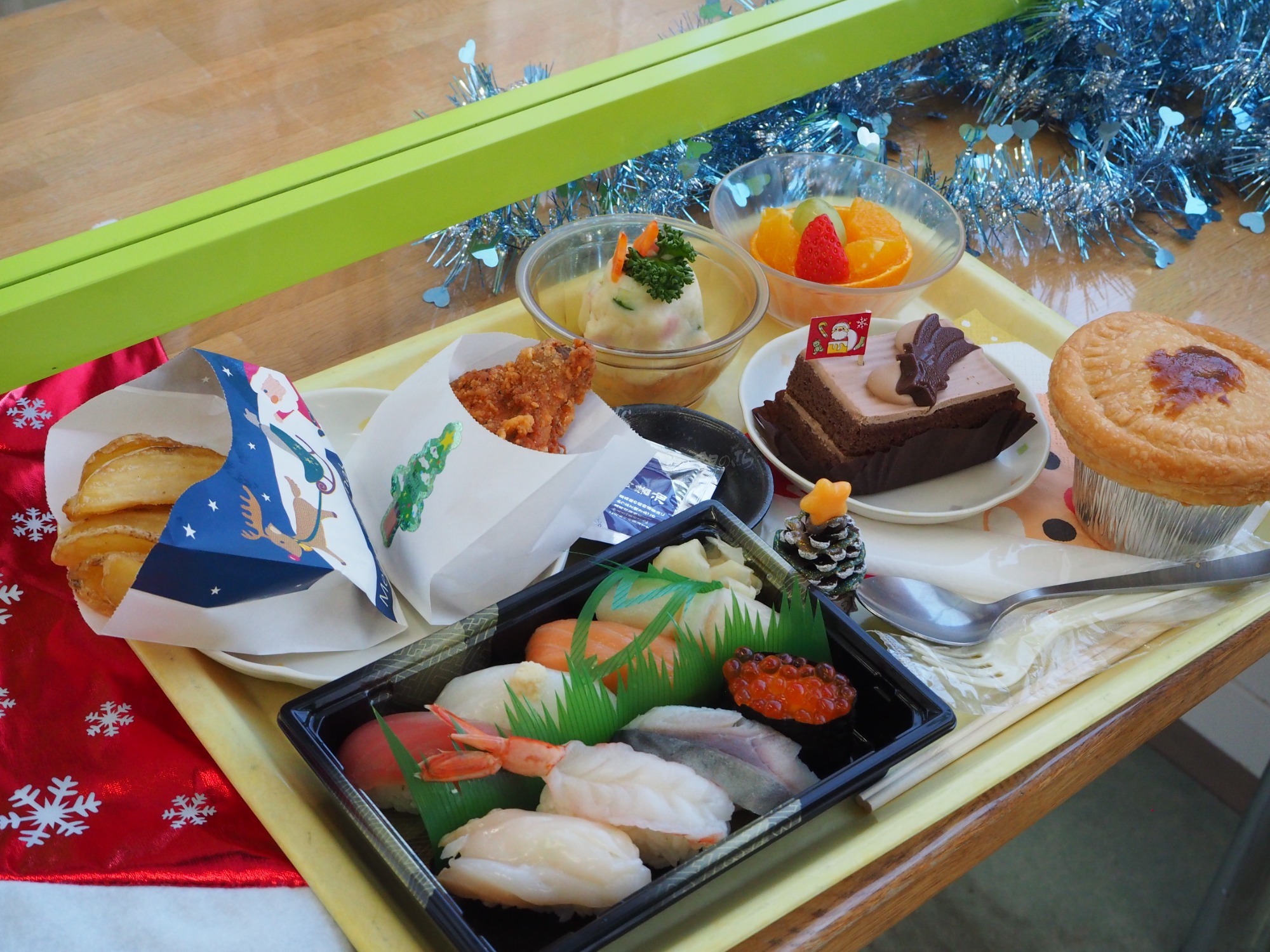 お昼はクリスマスの行事食です。彩り、味、品数も満点で皆さん大満足です。右端の「シチューポットパイ」はサクッとしたパイの下に温かいビーフシチューが入ってます。トロピカルカラーのフルーツ、ポテトサラダのミニツリー、チキンとフライドポテト、お寿司とチョコレートケーキも美味しかったです。手間を惜しまず準備してくださった給食スタッフの皆様に感謝いたします。