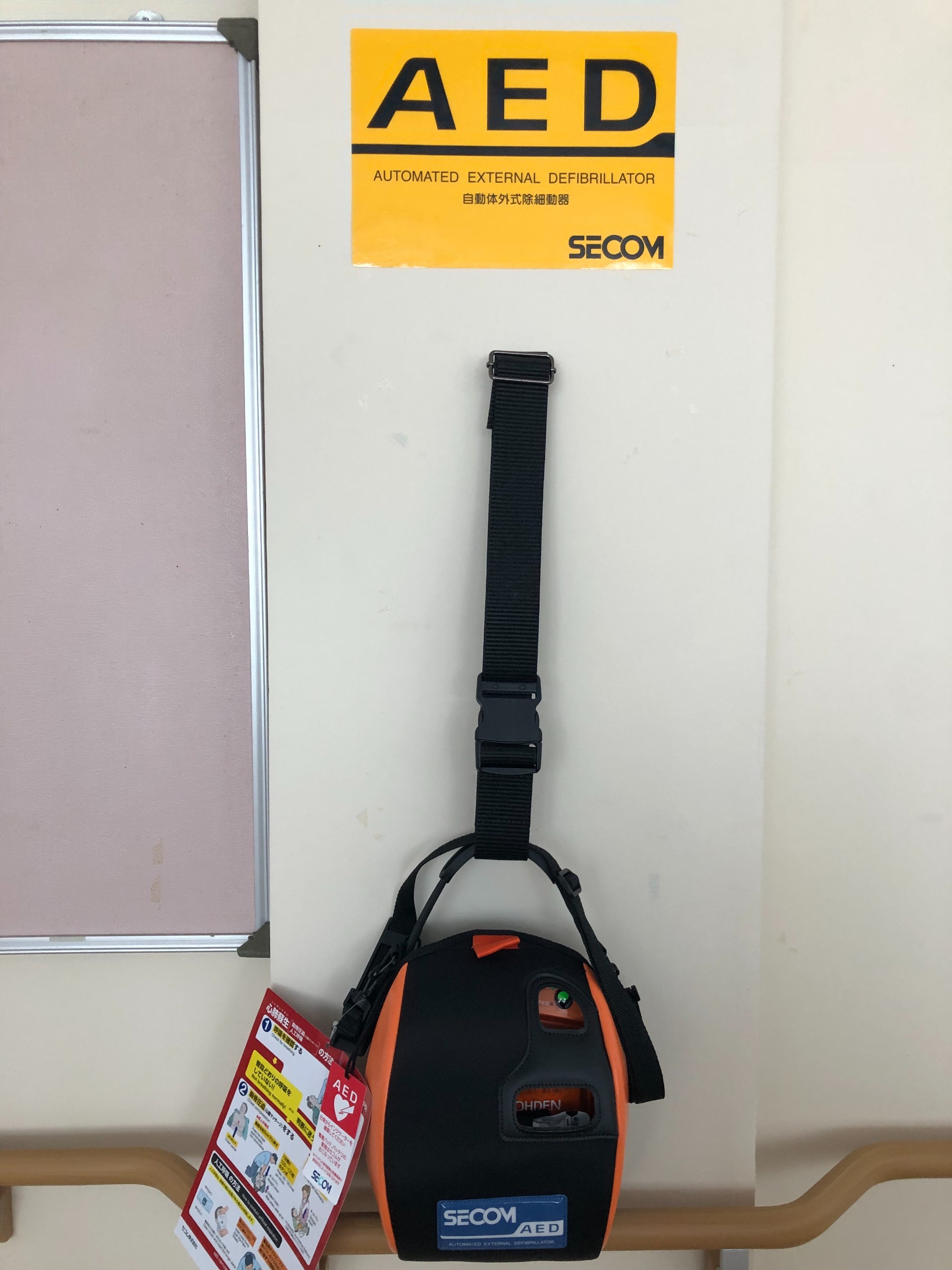 施設内中央に位置する介護詰所前にて保管しておりますが、地域のみなさまにも近くでAEDが必要な場合にはお貸しいたしますので、遠慮なくお声がけ下さい。
