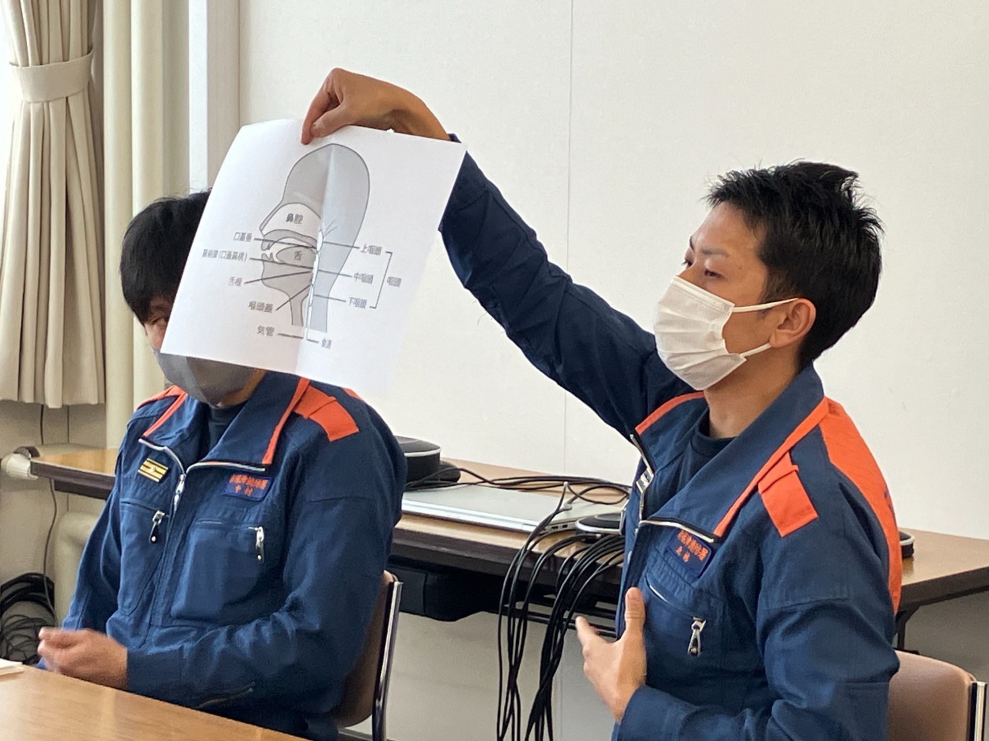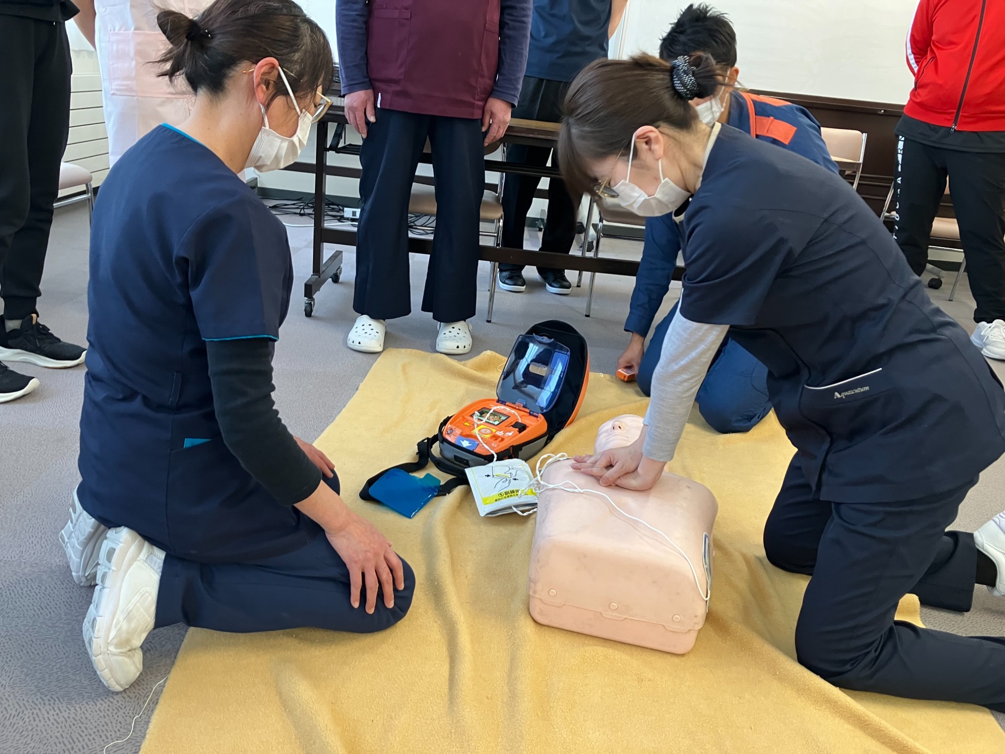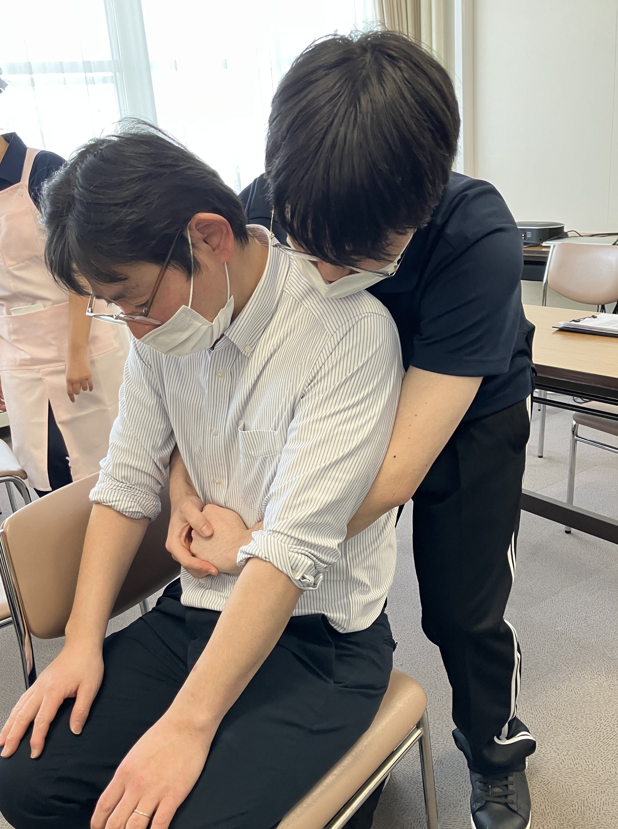 今回は窒息時の対応をメインに「背部叩打法」「ハイムリック法」「胸骨圧迫」「AED操作」の実技を集中的にご指導いただきました。
