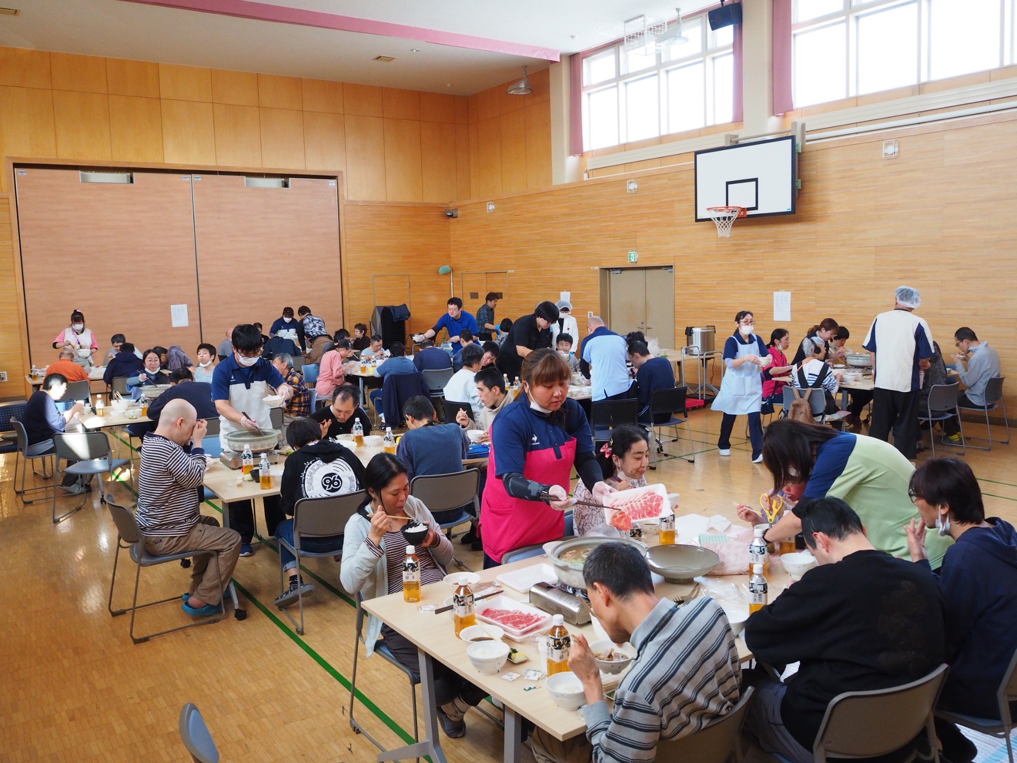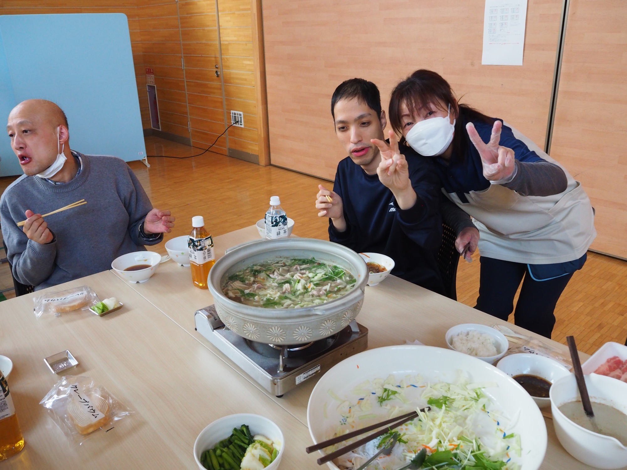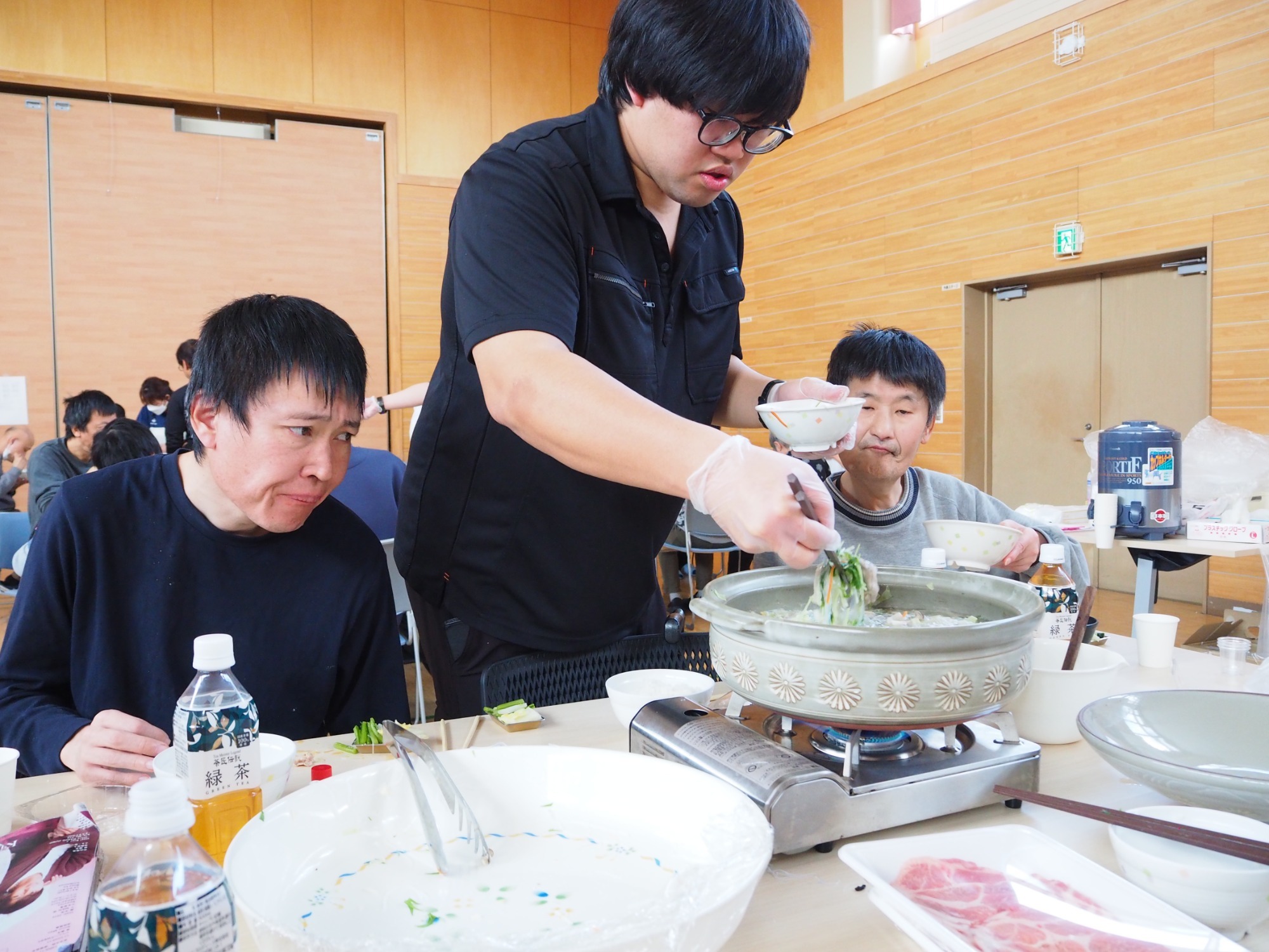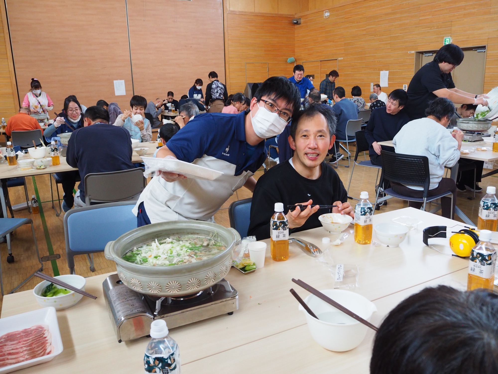 今日のお昼はアリーナに集合してしゃぶしゃぶ大会です。8テーブルに分かれてお鍋を囲みました。大きな土鍋がとってもいい雰囲気です。外は雪景色となりましたが、会場は鍋の熱気でちょっと暑いくらい。ちなみにしゃぶしゃぶのタレは調理主任の手作りでたいへん好評でした。
