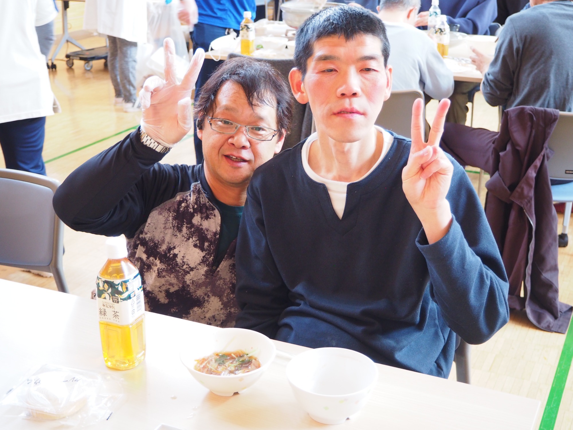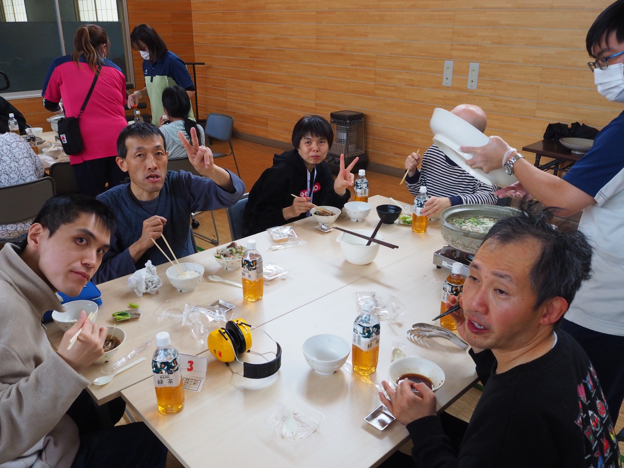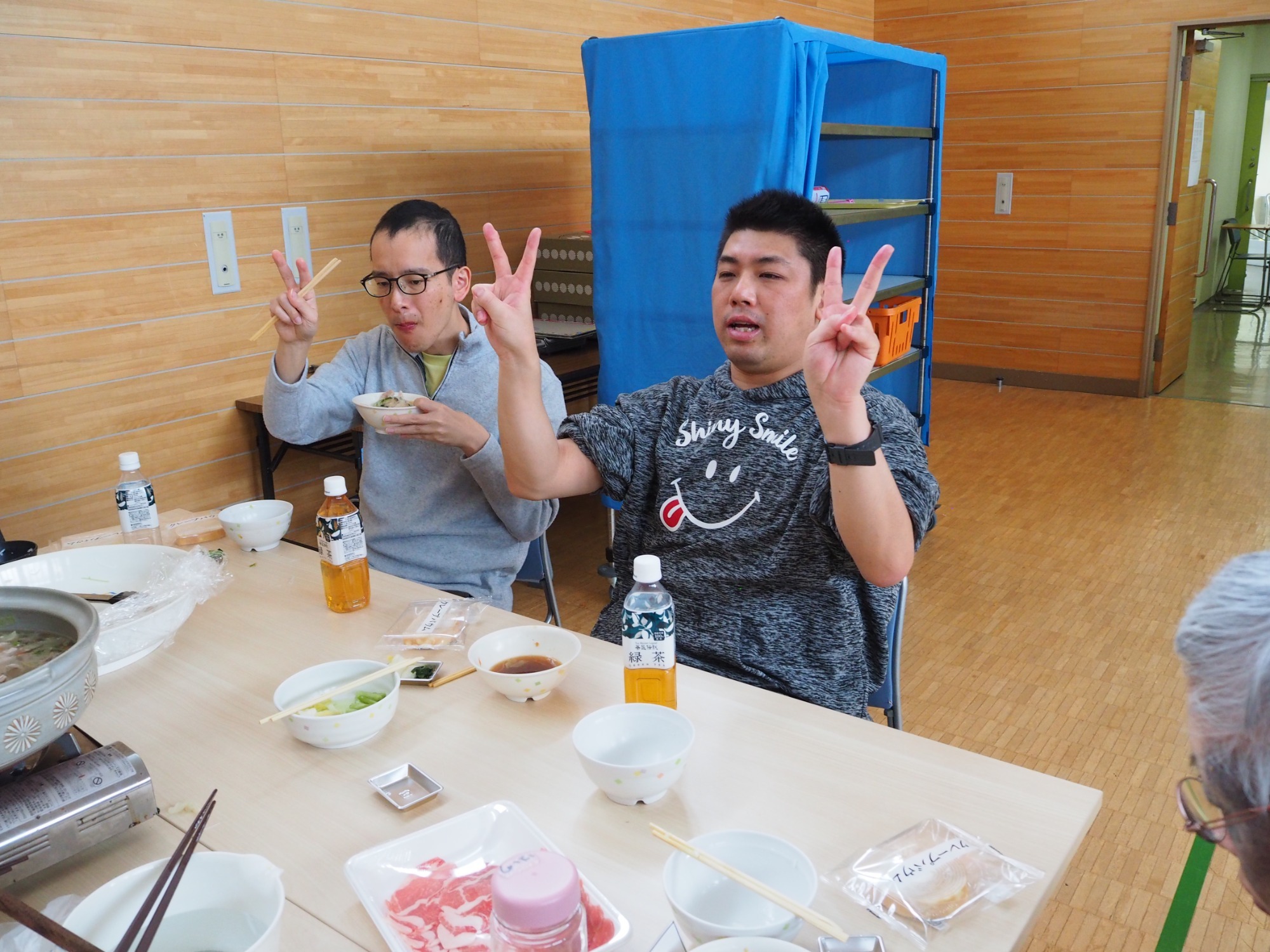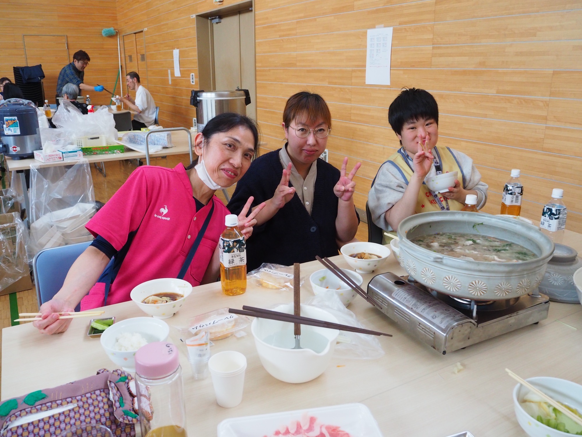今日のお昼はアリーナに集合してしゃぶしゃぶ大会です。8テーブルに分かれてお鍋を囲みました。大きな土鍋がとってもいい雰囲気です。外は雪景色となりましたが、会場は鍋の熱気でちょっと暑いくらい。ちなみにしゃぶしゃぶのタレは調理主任の手作りでたいへん好評でした。