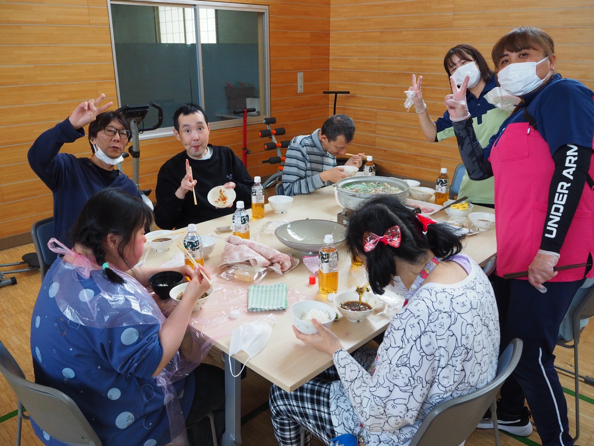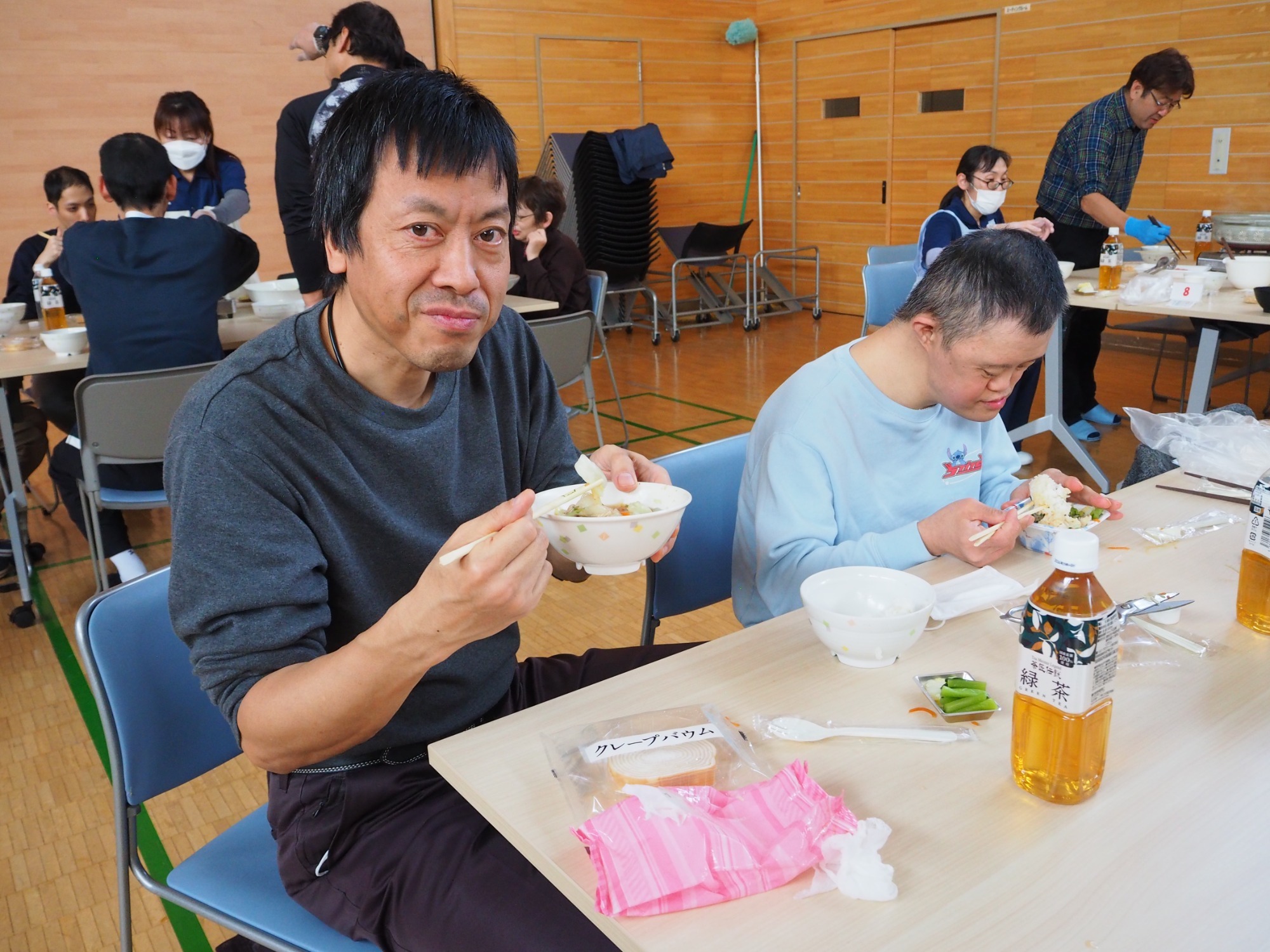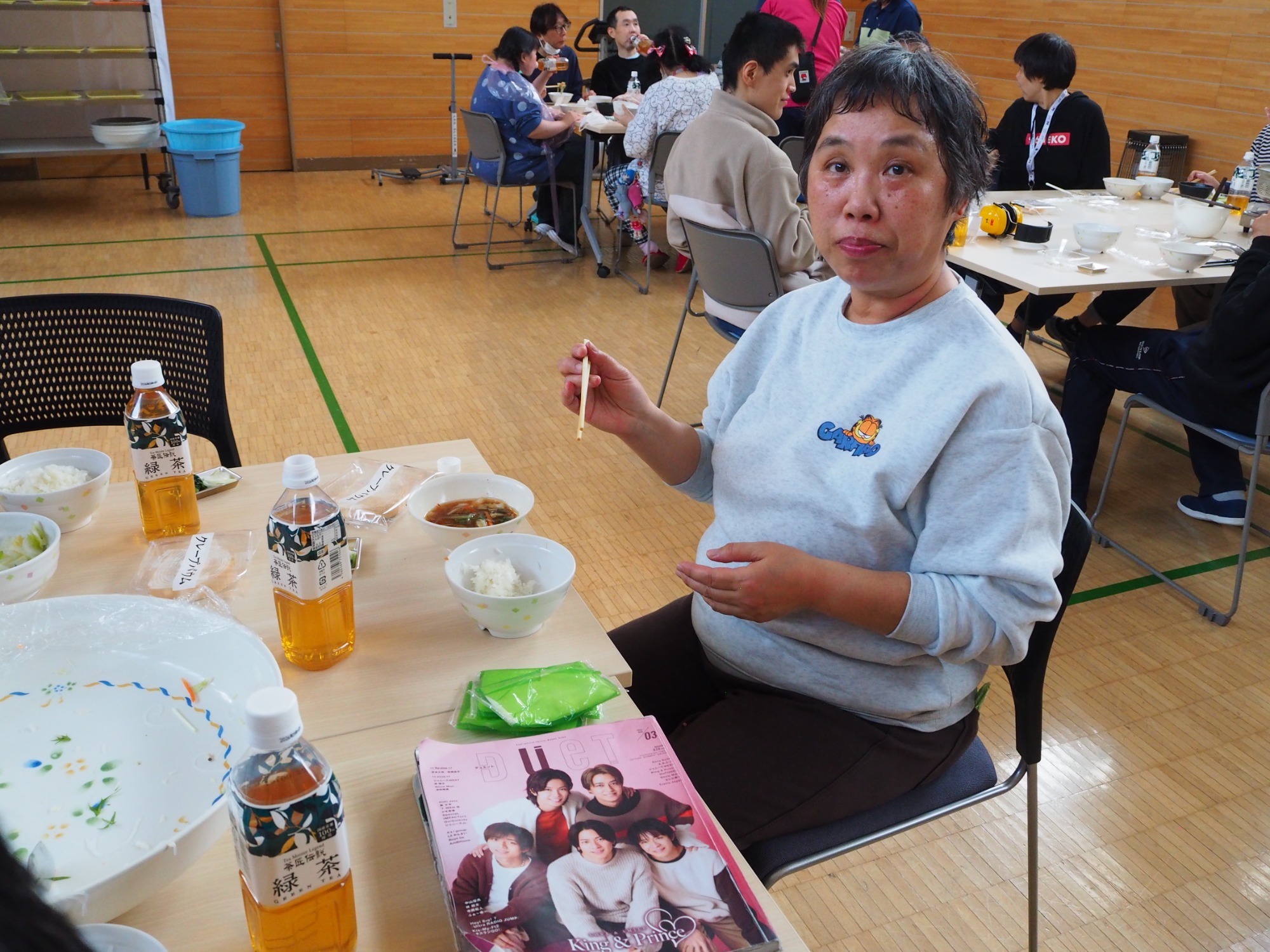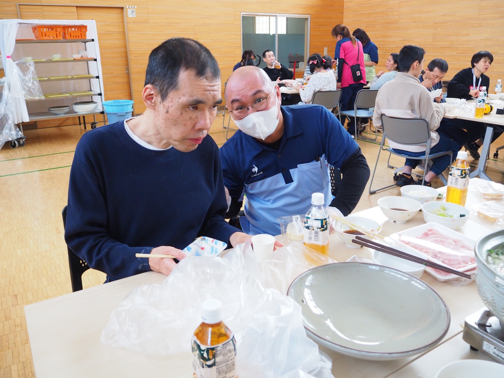 今日のお昼はアリーナに集合してしゃぶしゃぶ大会です。8テーブルに分かれてお鍋を囲みました。大きな土鍋がとってもいい雰囲気です。外は雪景色となりましたが、会場は鍋の熱気でちょっと暑いくらい。ちなみにしゃぶしゃぶのタレは調理主任の手作りでたいへん好評でした。